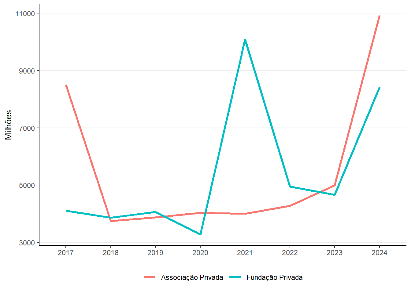 | Associação Privada | 8.511 | 3.746 | 3.876 | 4.037 | 3.996 | 4.281 | 4.988 | 10.930 |