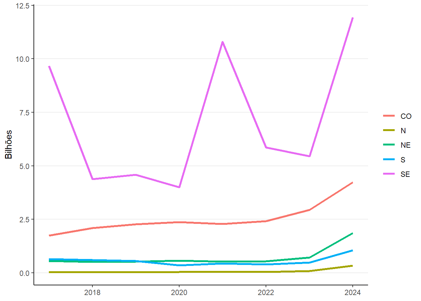 | Centro-Oeste | 1.742,7 | 2.097,7 | 2.263,1 | 2.373,4 | 2.282,4 | 2.411,2 | 2.939,9 | 4.229,9 |