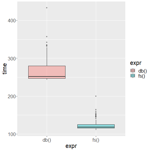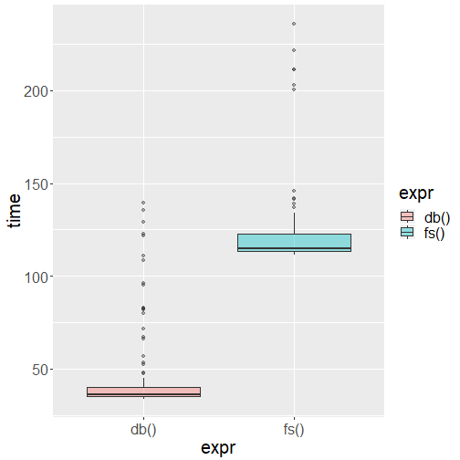 We can compare performance using the microbenchmark package. The following code downloads a month worth of taxi cab data and imports the file into a SQL table. I use a T-SQL bulk command because it is orders of magnitude faster at importing data then using an R function or single SQL insert statement.
