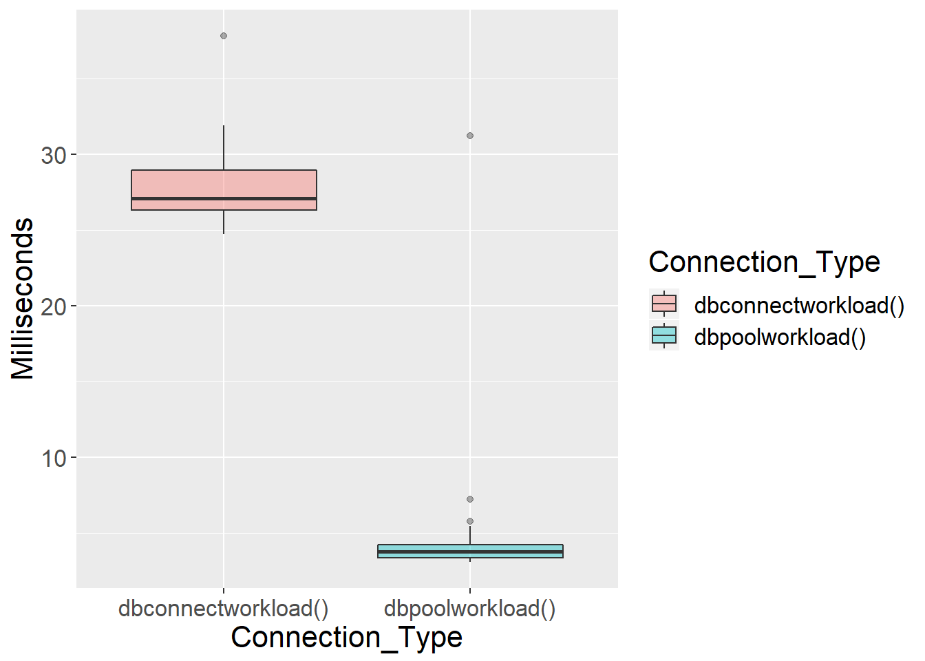 The pool package opens and closes connections automatically. R users establish a connection to a pool. From then on pool gives the query an idle connection or opens a new connection. Besides simplifying client code, pooled connections can also provide a performance boost. To illustrate, I wrote a sample workload consisting of three queries. Next, I wrote a function to execute the queries using dbConnect/dbDisconnect, and a function to execute the queries using a pool.