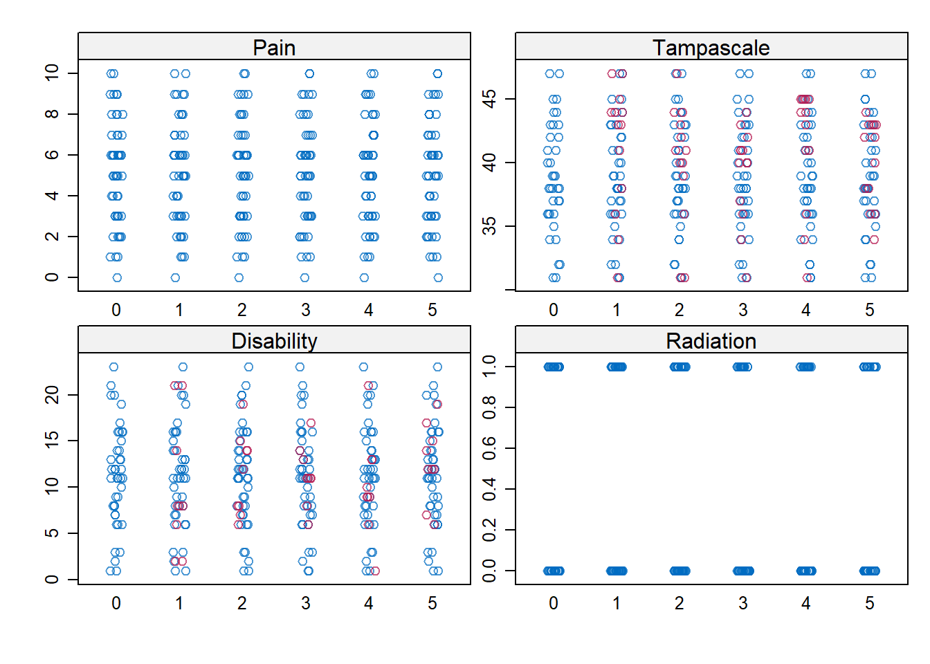 imp <- mice(data, m=5, maxit=10, method=c("", "pmm", "pmm", "logreg"), printFlag = FALSE)## Warning: Type mismatch for variable(s): Radiation