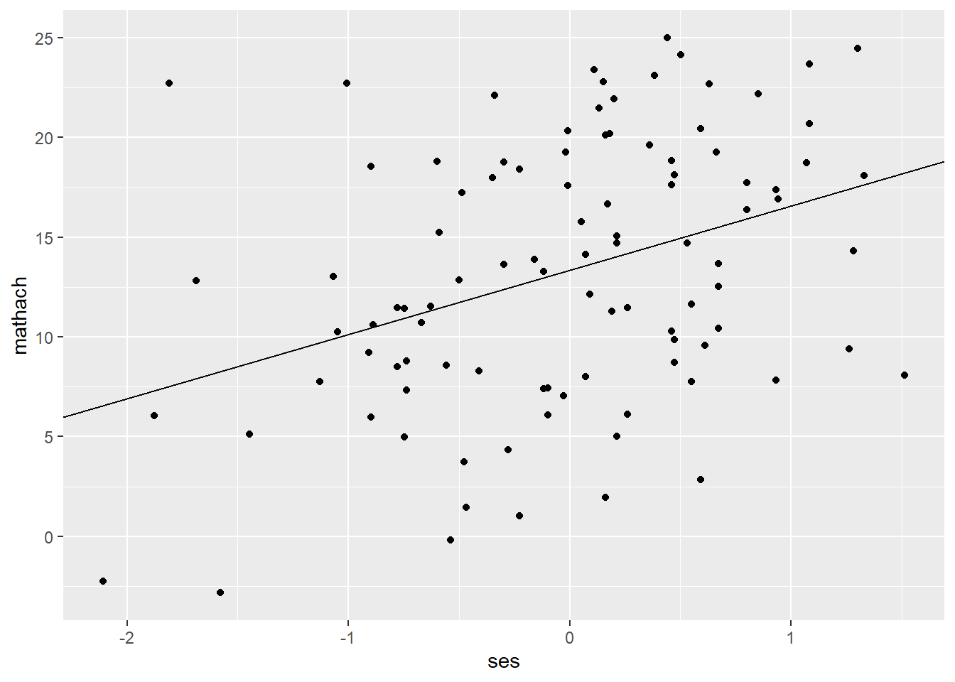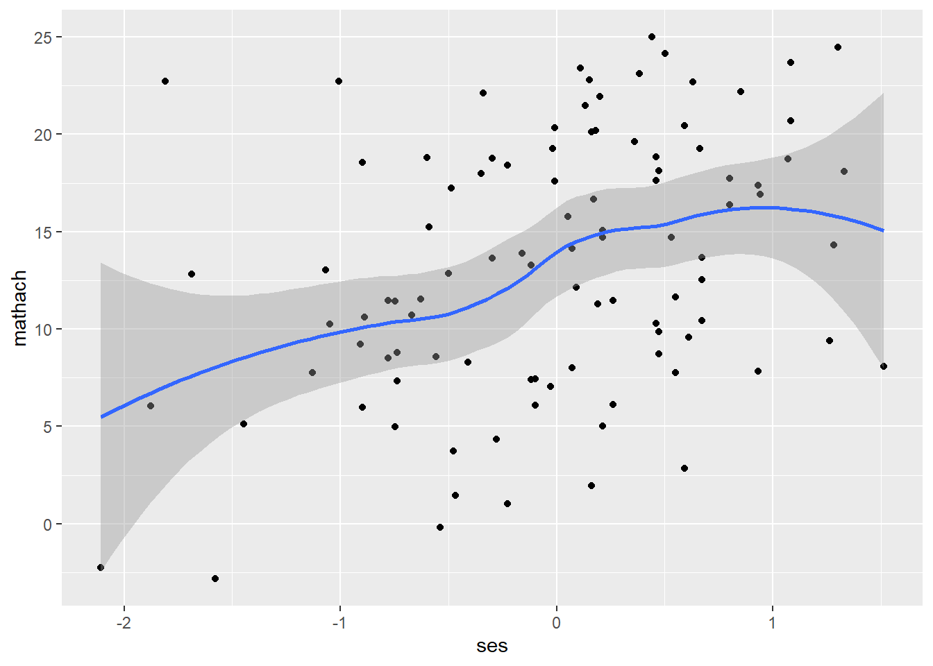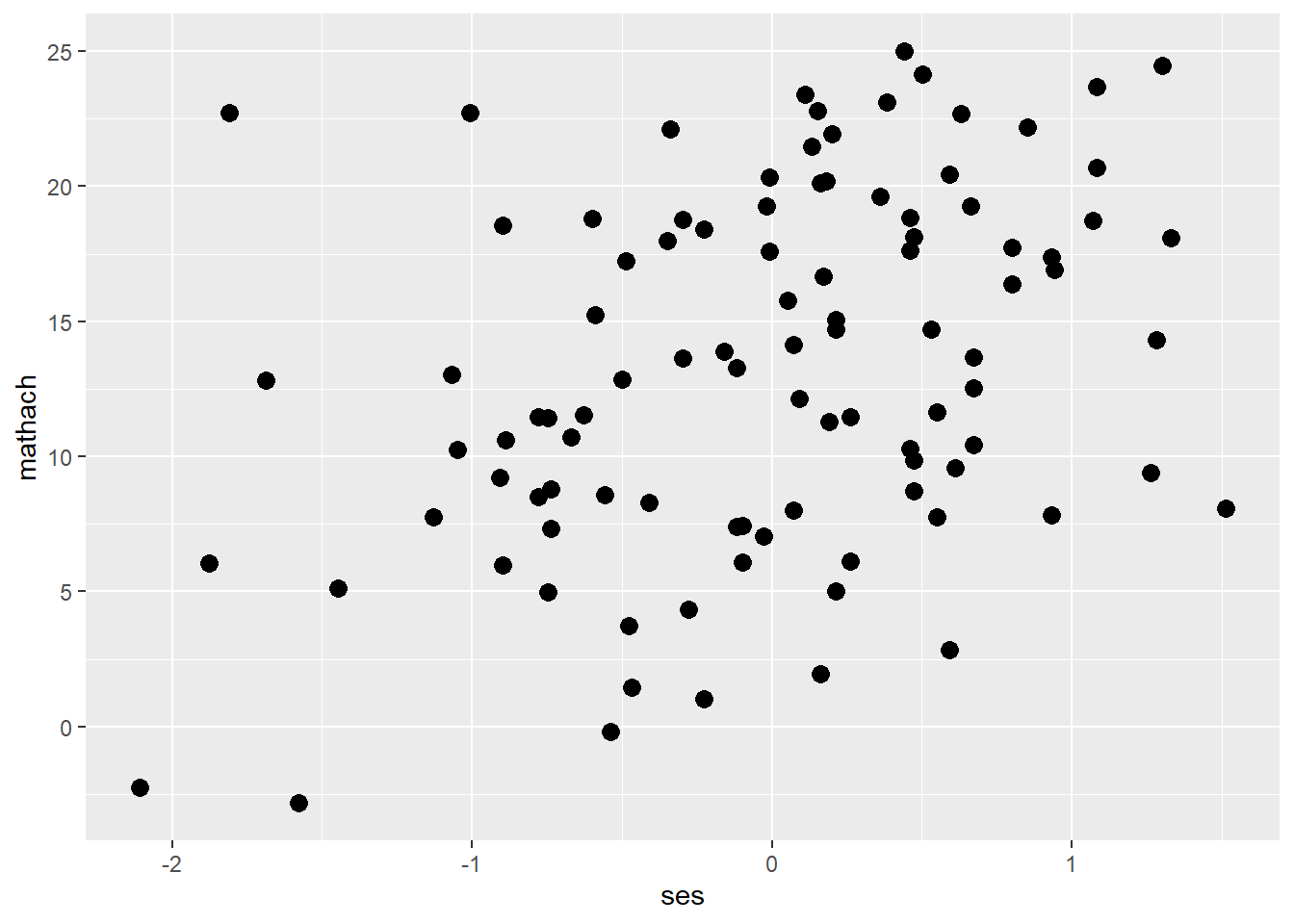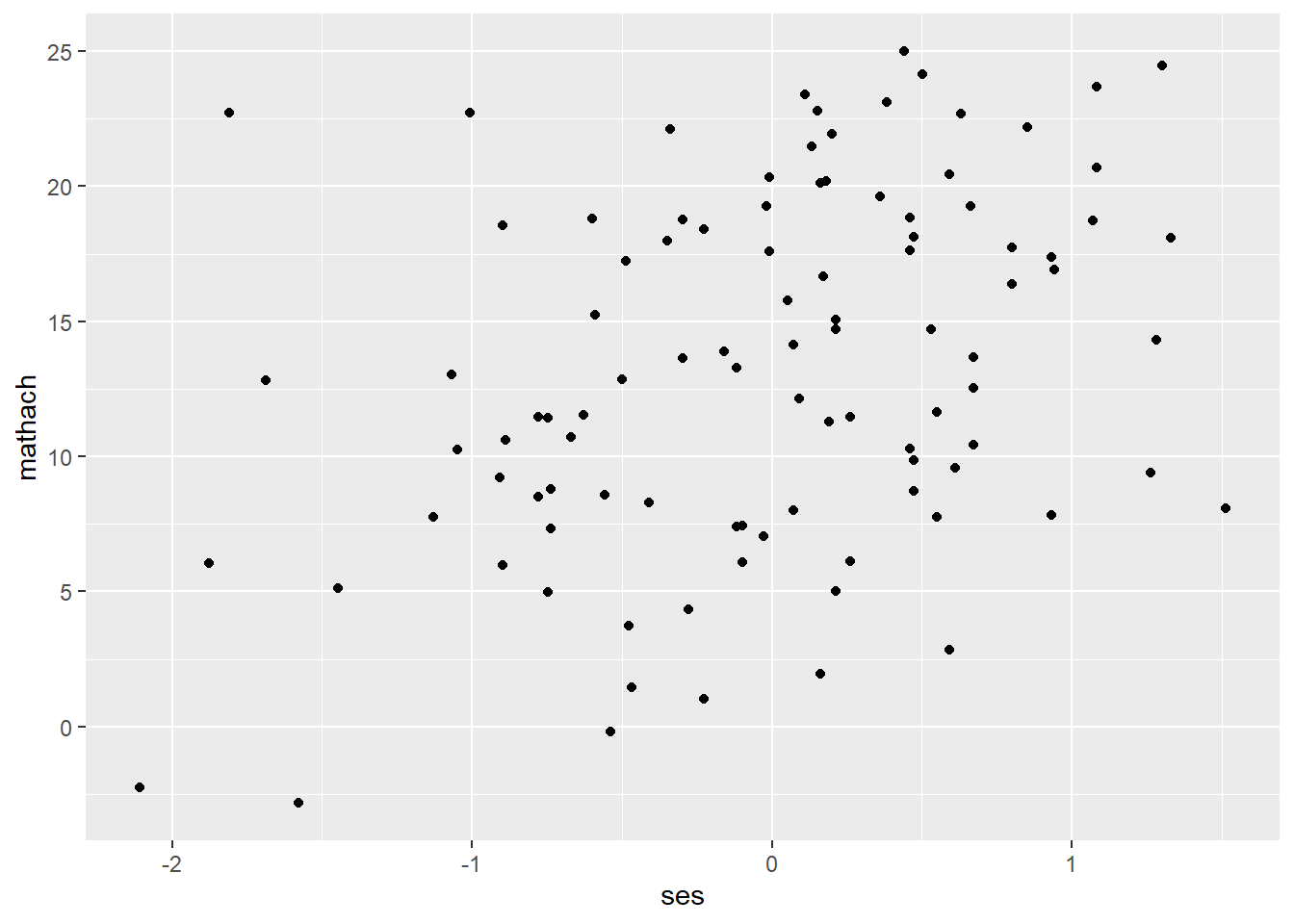 ggplot(data = hsb, mapping = aes(ses, mathach)) + # create a ggplot object