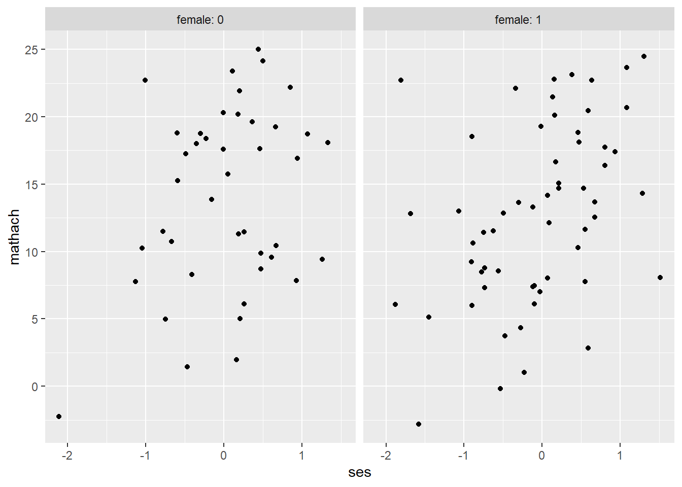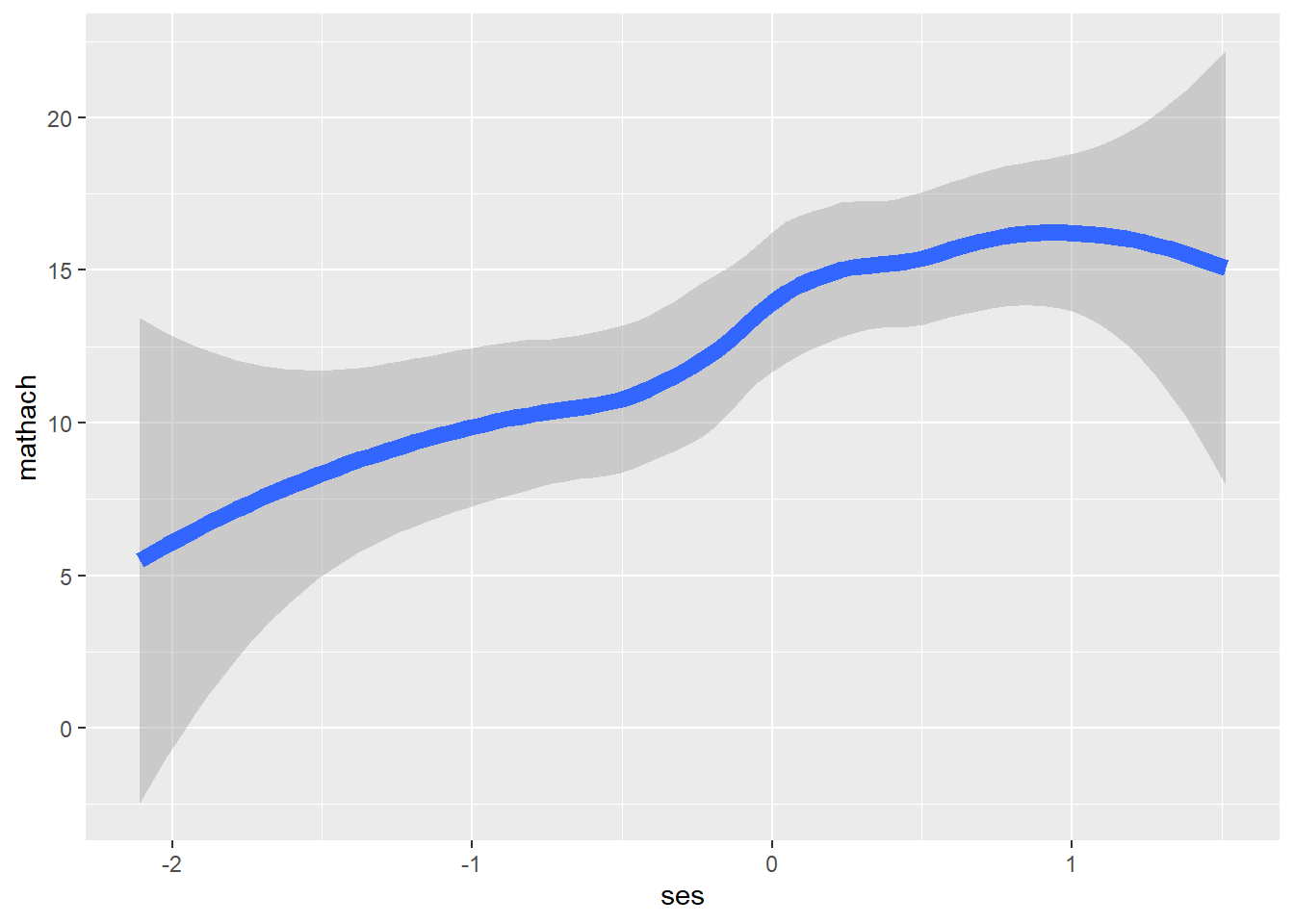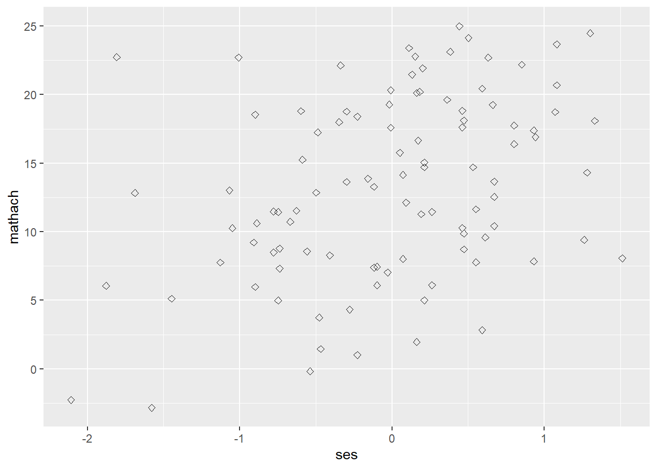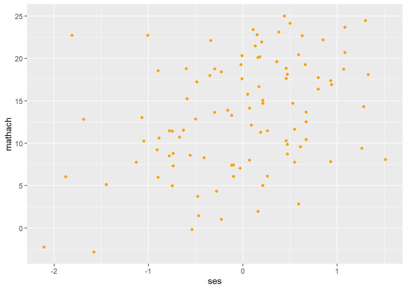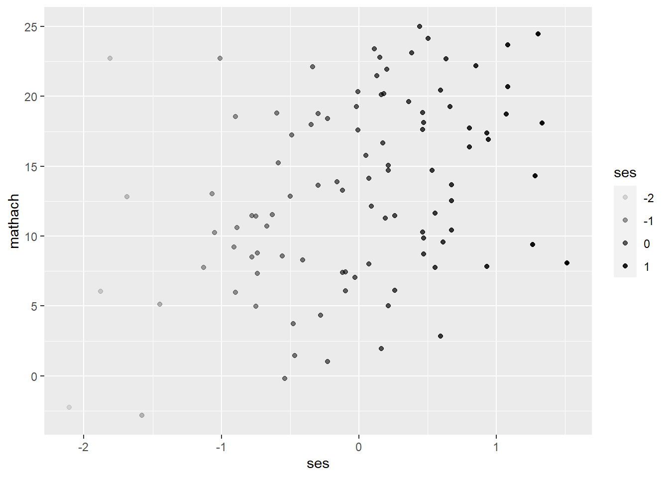 ggplot(data = hsb, mapping = aes(ses, mathach)) + # create a ggplot object