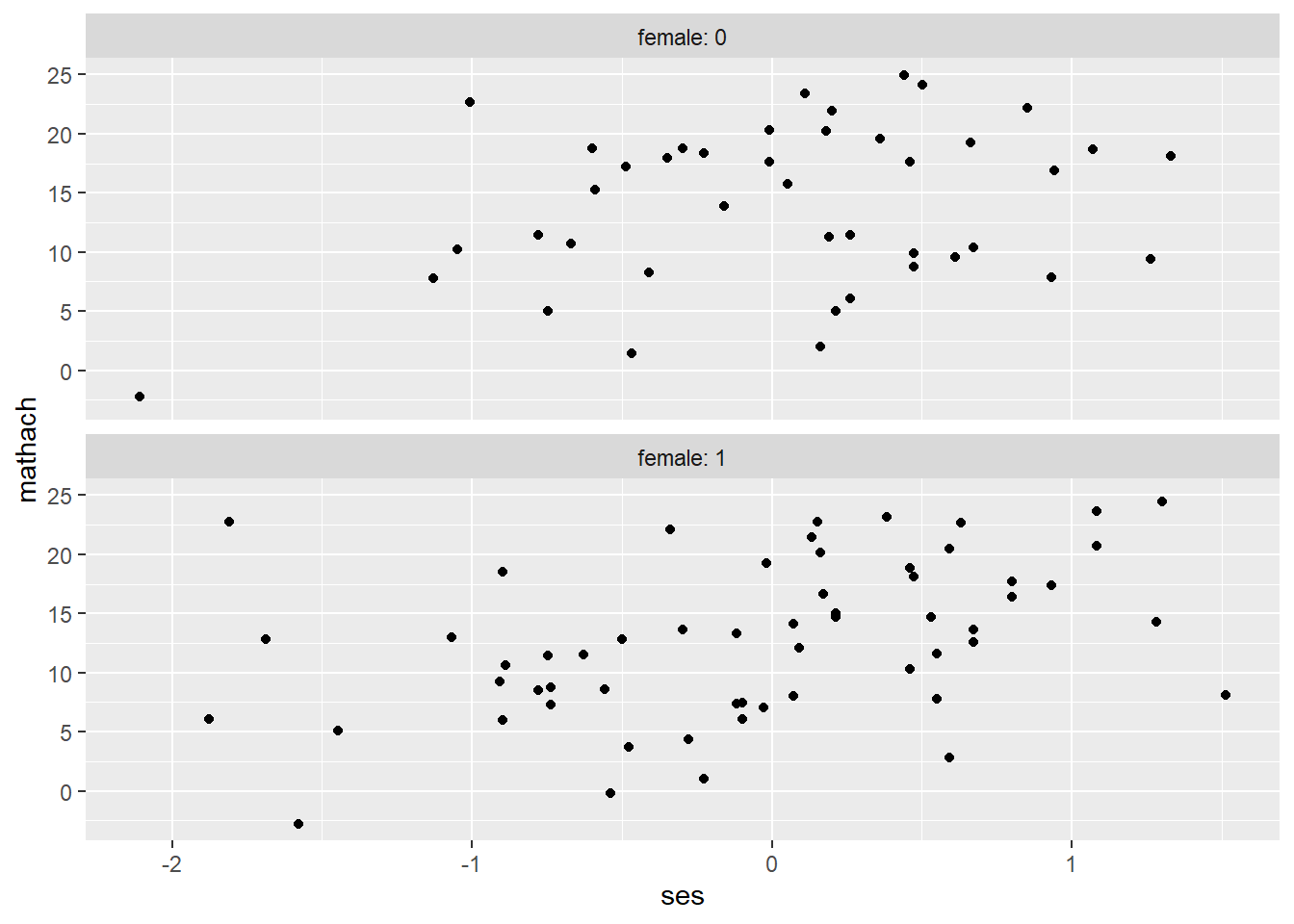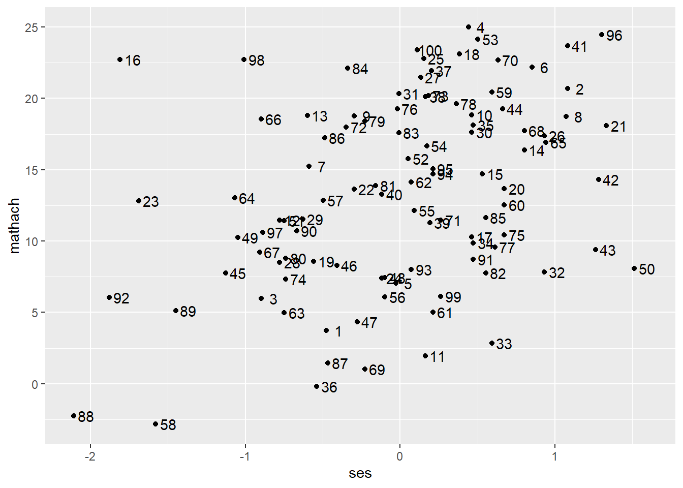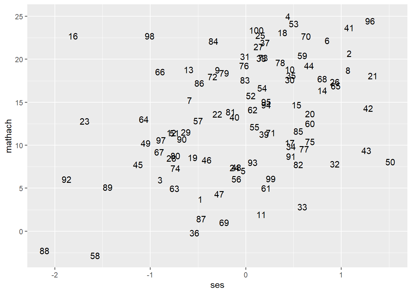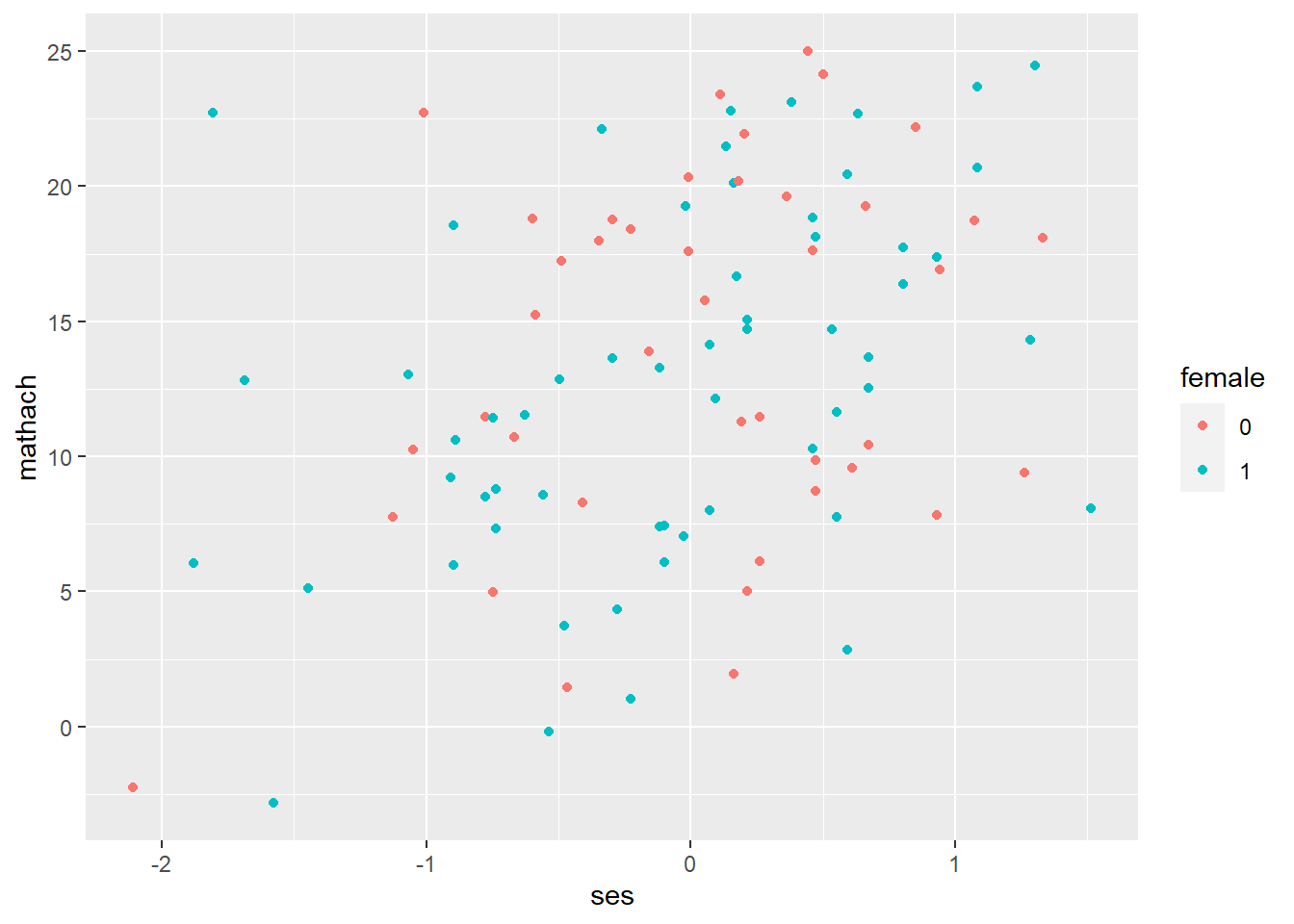 ggplot(data = hsb, mapping = aes(ses, mathach)) + # create a ggplot object