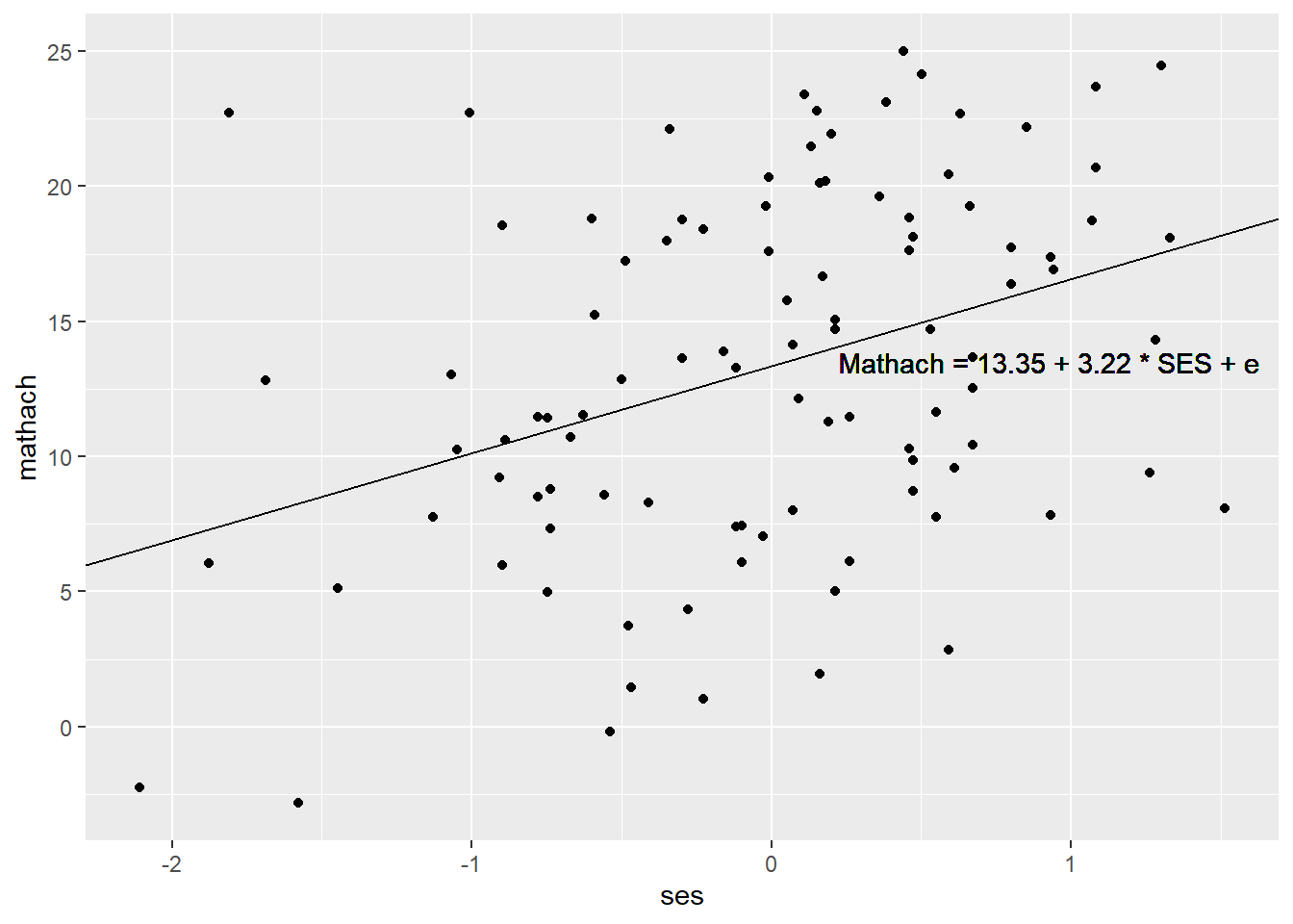 geom_text(aes(label = "Mathach = 13.35 + 3.22 * SES + e"), x = 0.93, y = 13.5) # add the equation