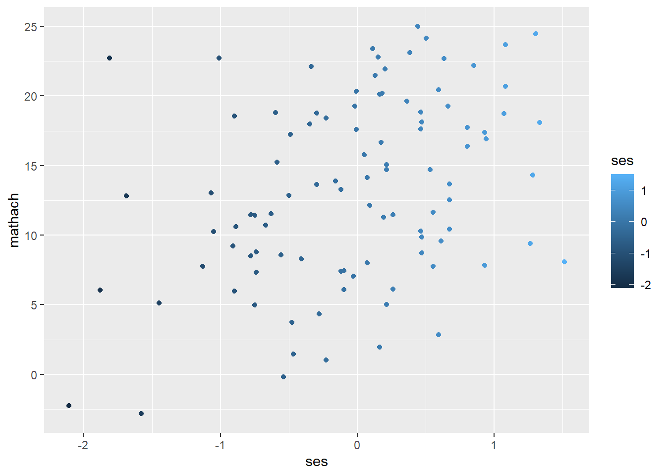 geom_point(aes(color = ses)) # map colors to 'ses' (continuous)