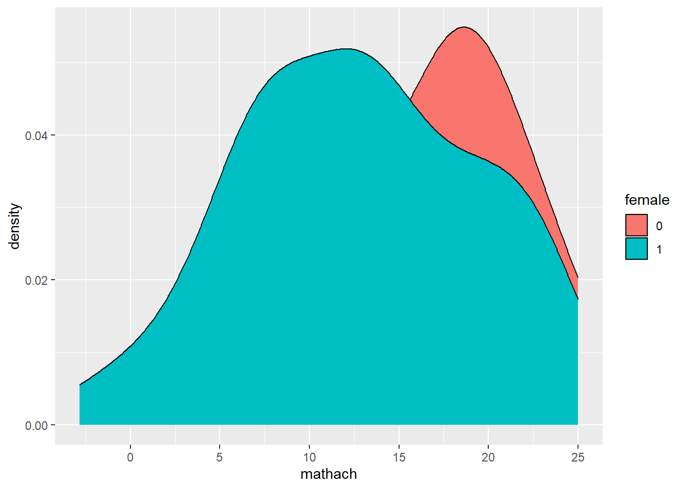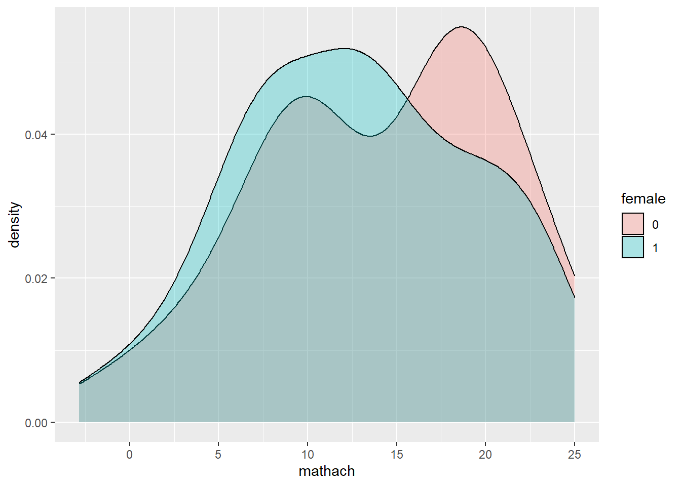 geom_density(aes(fill=female)) # map colors to 'female'