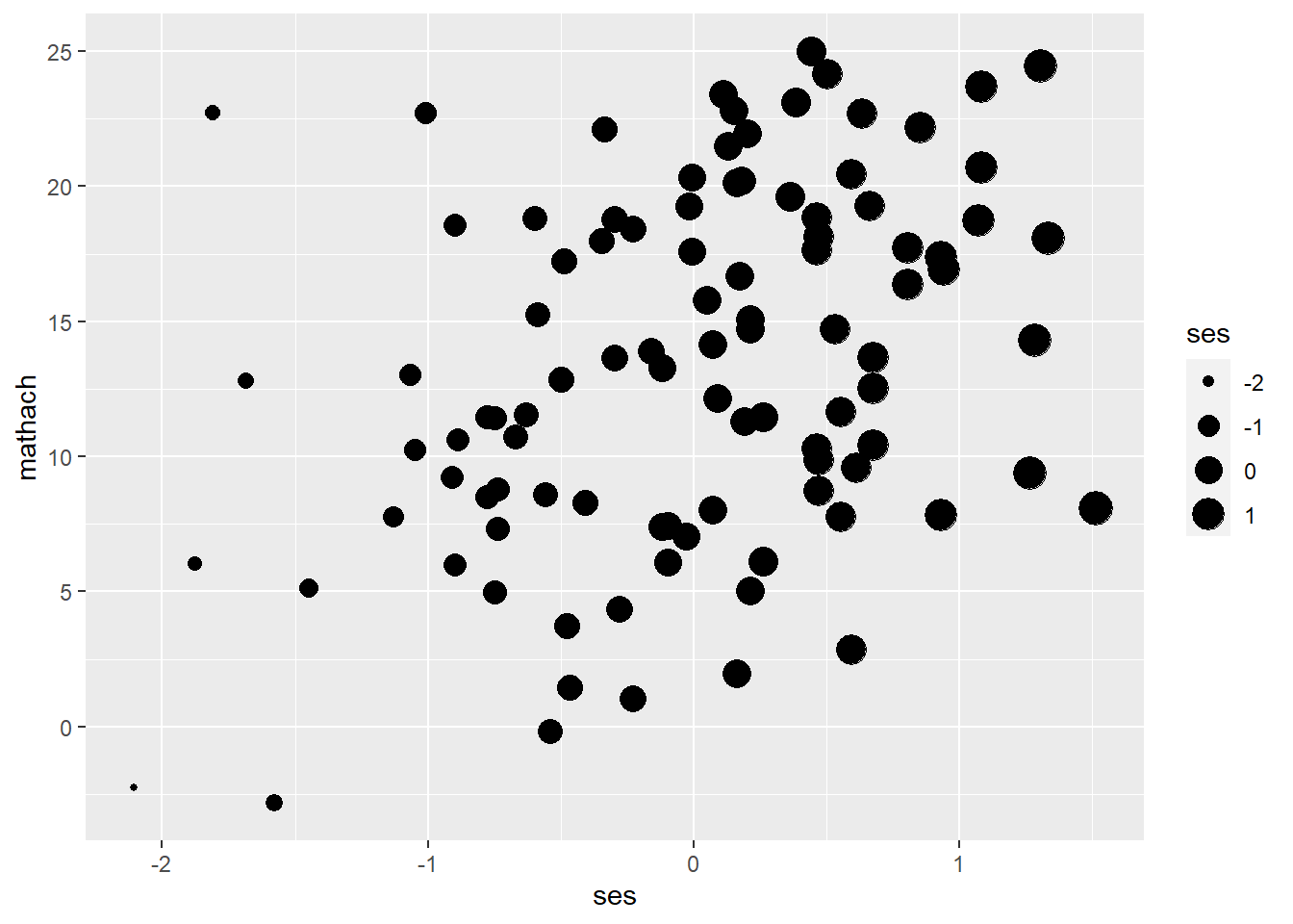 geom_point(aes(size = ses)) # map size of points to 'ses'