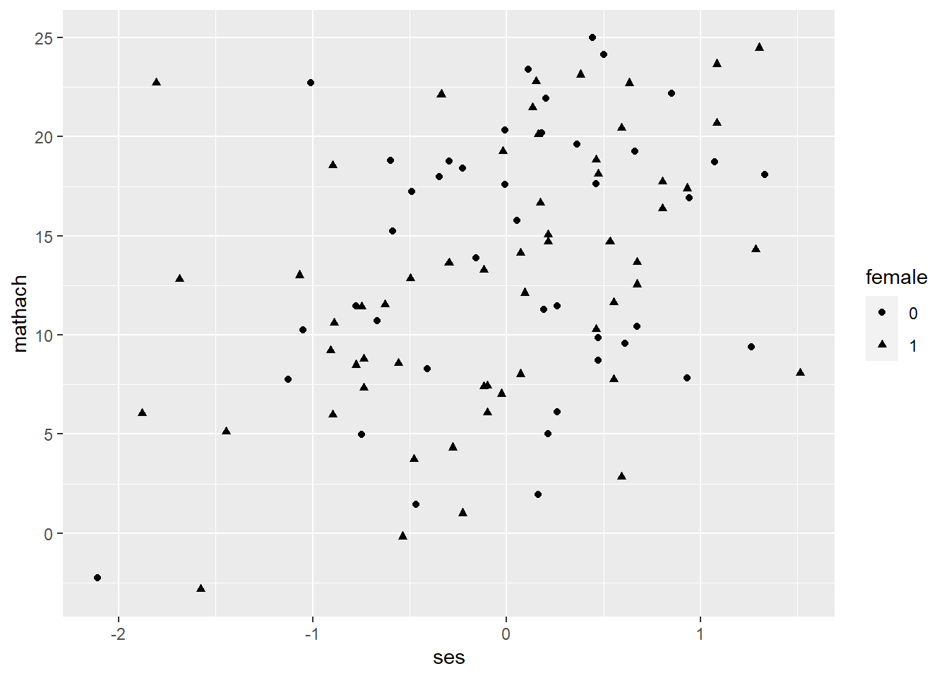 geom_point(aes(shape = female)) # map shape of points to 'female'