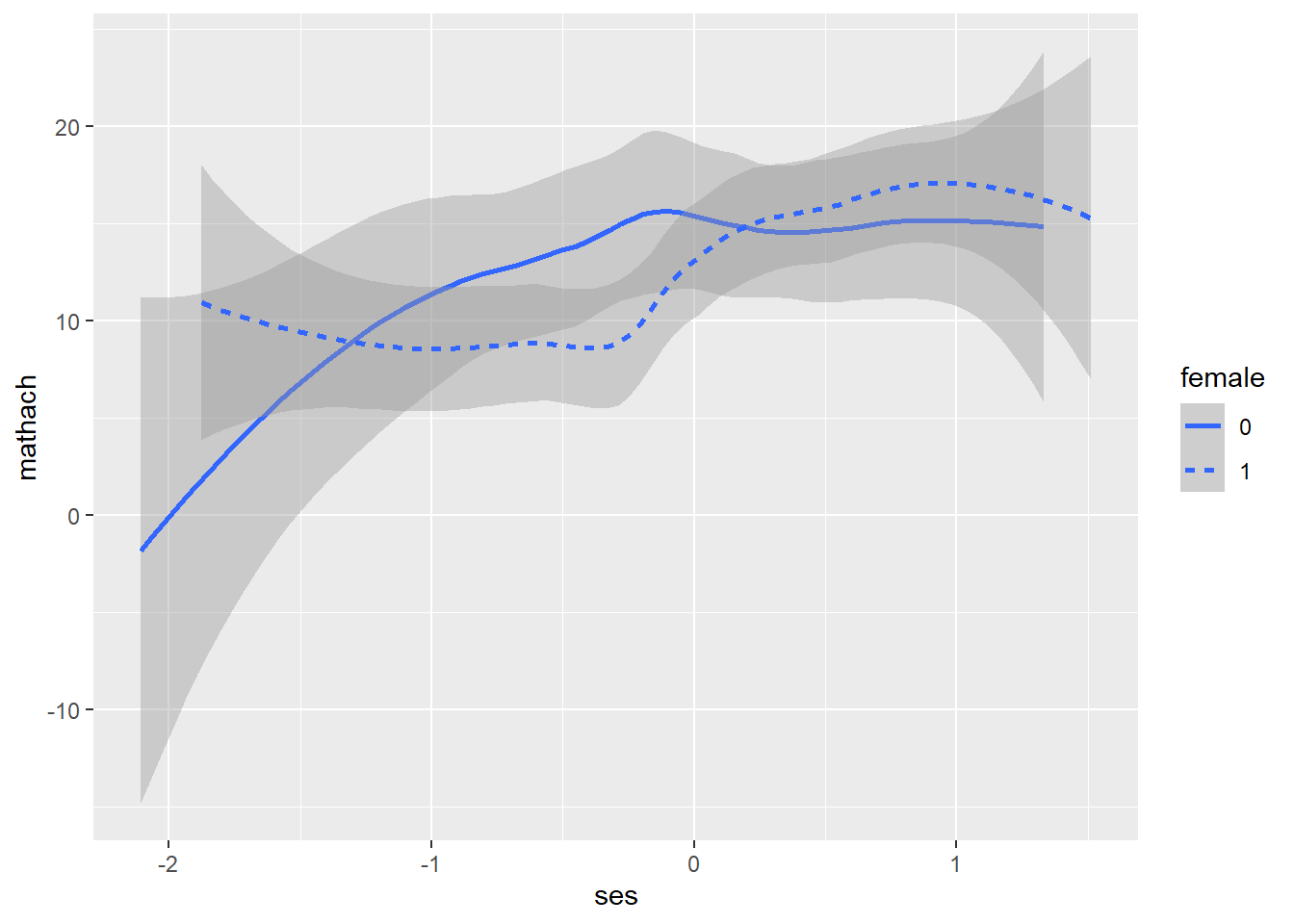 geom_smooth(aes(linetype = female)) # map type of lines to 'female'## `geom_smooth()` using method = 'loess' and formula 'y ~ x'