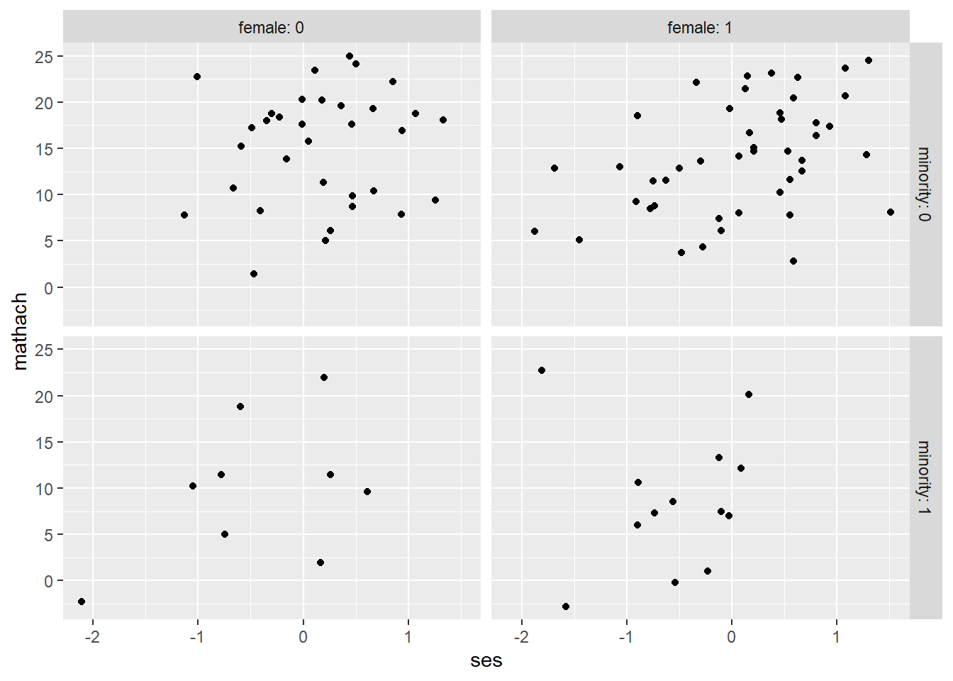 facet_grid(rows = vars(minority), cols = vars(female), labeller = "label_both")