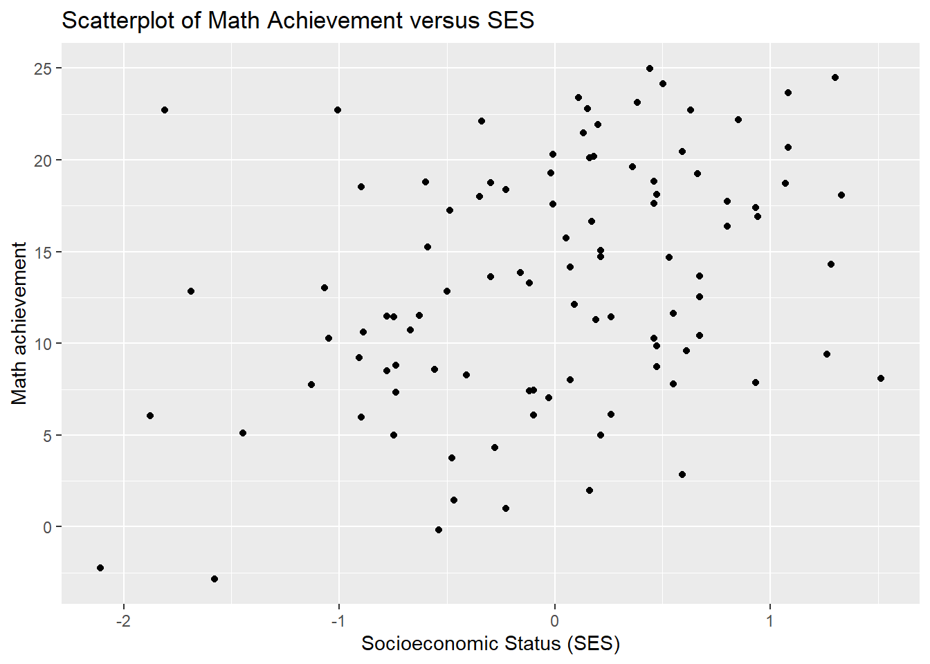 title = "Scatterplot of Math Achievement versus SES")