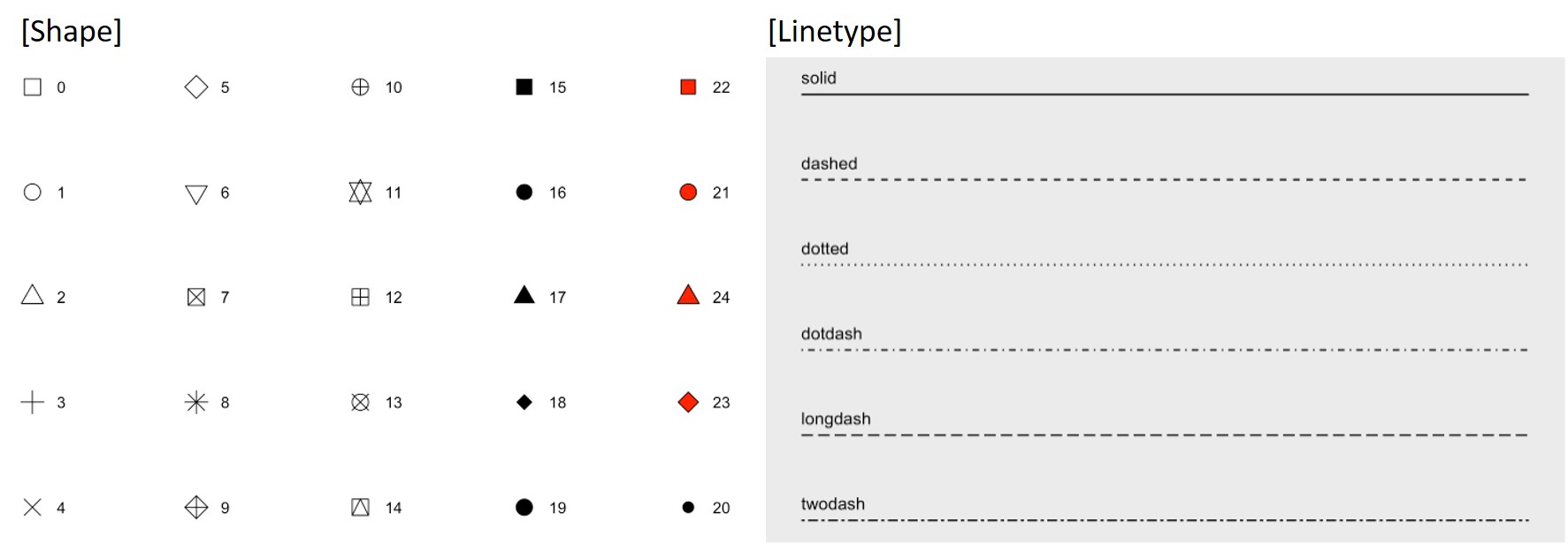 Again, we need to include the arguments outside aes() to set the size and type of points/lines. To identify the type of points/lines, use the numbers/names shown in the figure below.