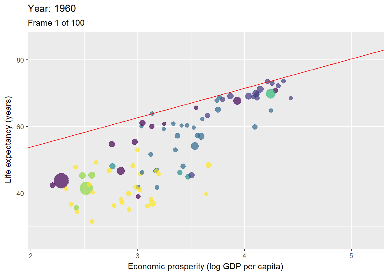 Figure 3.10 is an animated figure showing the time trends. In the figure, each data point is a country. The size of a data point refers to the country’s population size, and the color to the geographic region to which it belongs, e.g., yellow for the Sub-Saharan region, and violet for East Asian and Pacific region.
