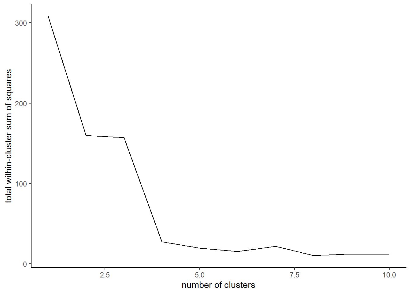 So \(k = 2\) is clearly not enough, and \(k = 5\) seems good. But what about \(k = 4\) or \(k = 10\)? The way we figure out the optimal \(k\) is by calculating the total within-cluster sum of squares across a range of \(k\) values and then looking for when we stop reducing within-cluster variation dramatically by adding more clusters. Let’s use a for loop to do this!