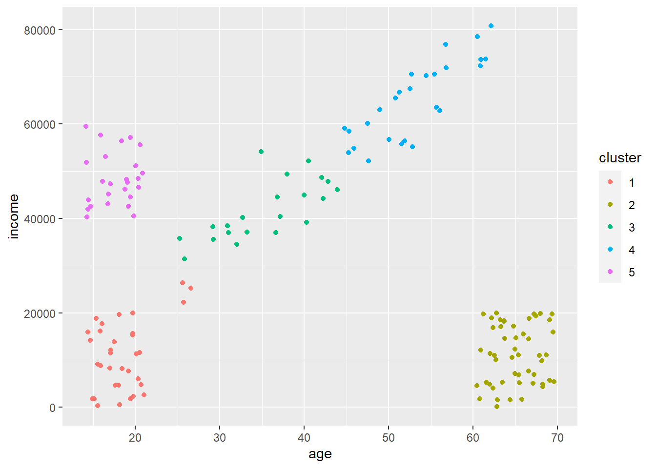 Below is the cluster assignment when we use features that were not scaled. We can see that all the clustering happens in response to income which is why there are horizontal ‘bands’. Age is essentially ignored.