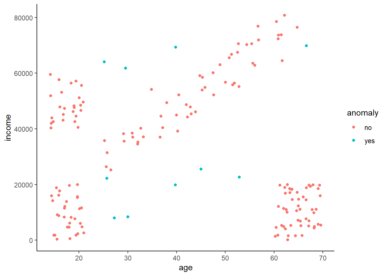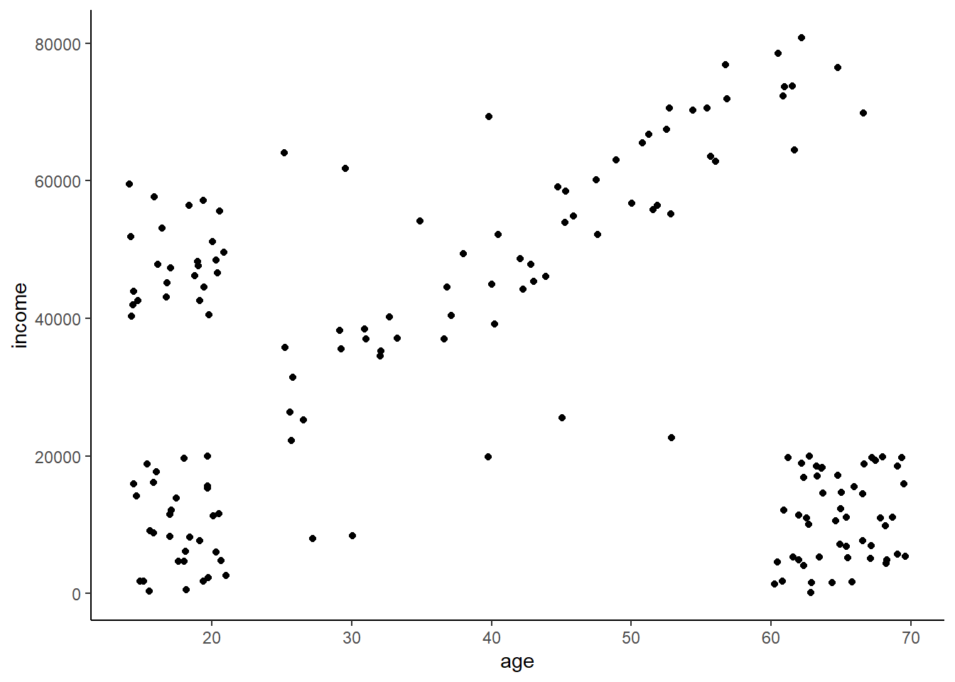Let’s consider the age and income data we used in the last lesson. Imagine you’re a marketer trying to sell fancy stuff to college aged kids. This stuff is expensive (let’s say some hype-beast Supreme stuff)(‘hello, fellow kids’) (June 2022 update: This attempt a joke didn’t age well. I’ll stop trying to be funny - I’m too old for it.), so you don’t want to bother advertising to older people or young people who don’t have money. You were able to purchase income and age data from a variety of people that you want to segment so you can rapidly advertise to the targeted group.