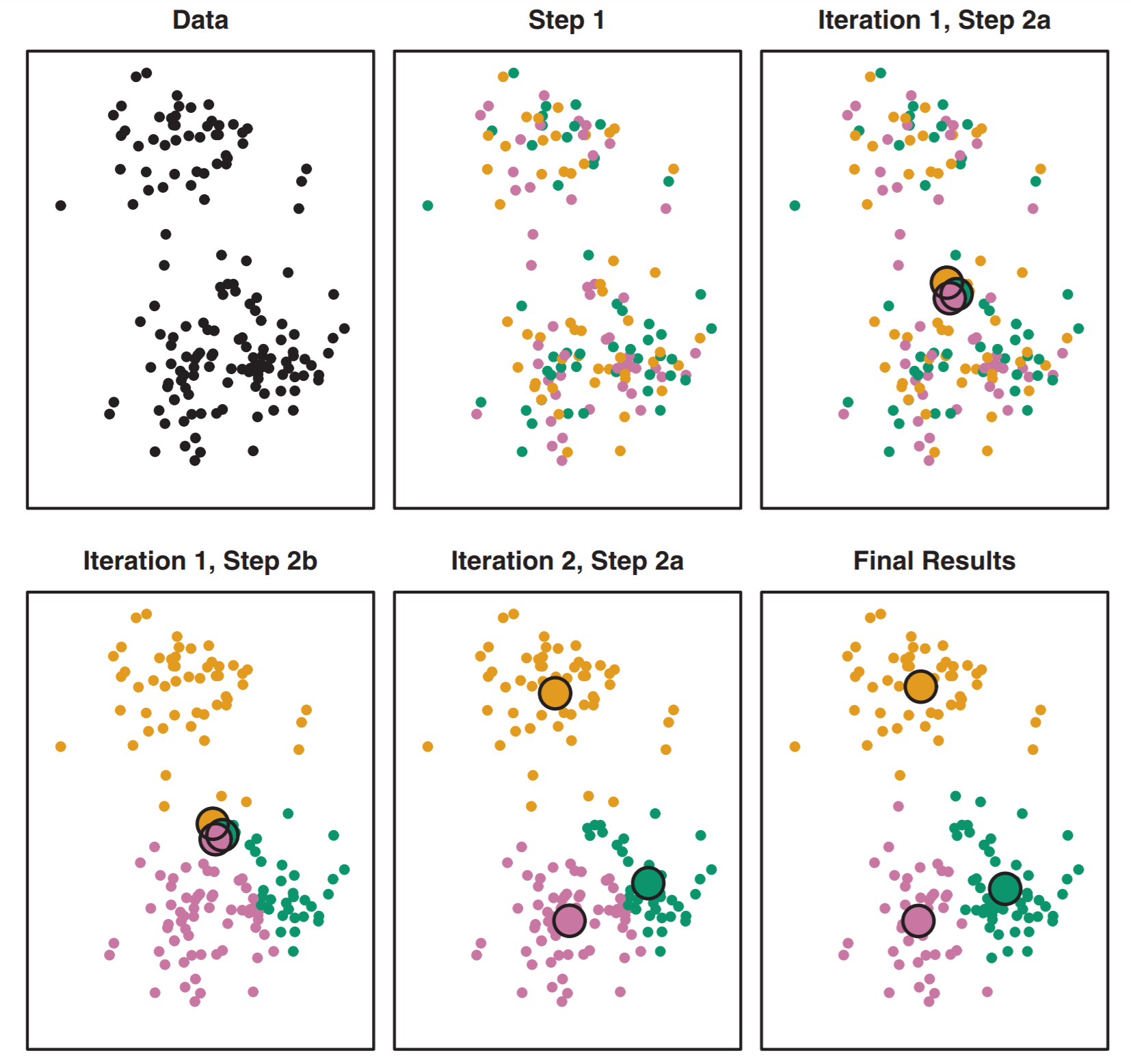 The algorithm starts by randomly assigning each of your observations to only one of the \(k\) clusters.