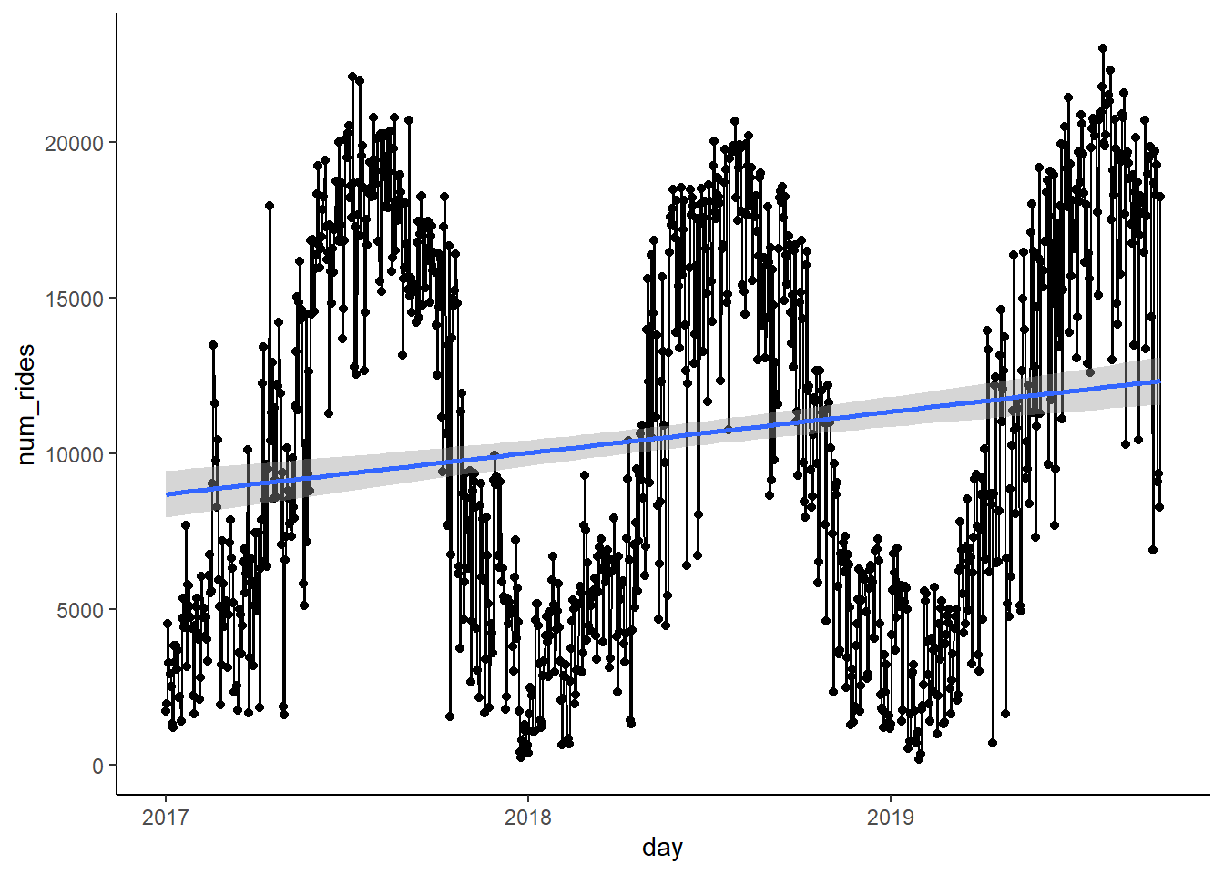 The other less obvious one is the trend. The trend is the average pattern over the course of the data. In this case it’s that the average number of rides goes up over time (which makes sense as its popularity increases). We can overlay a quick linear model which shows this.