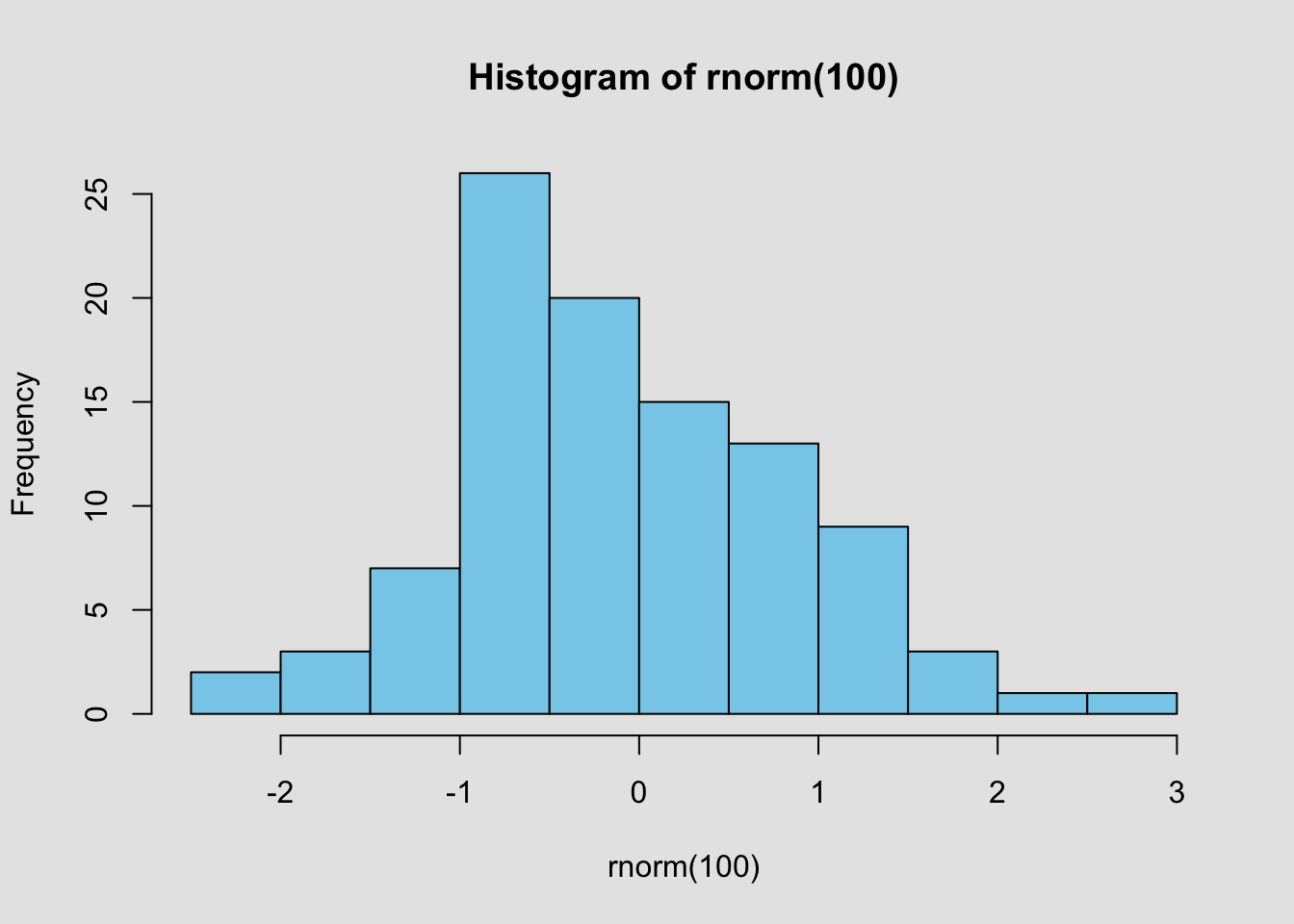 To change the background color of a plot, add the command par(bg = col) (where col is the color you want to use) prior to creating the plot. For example, the following code will put a light gray background behind a histogram:
