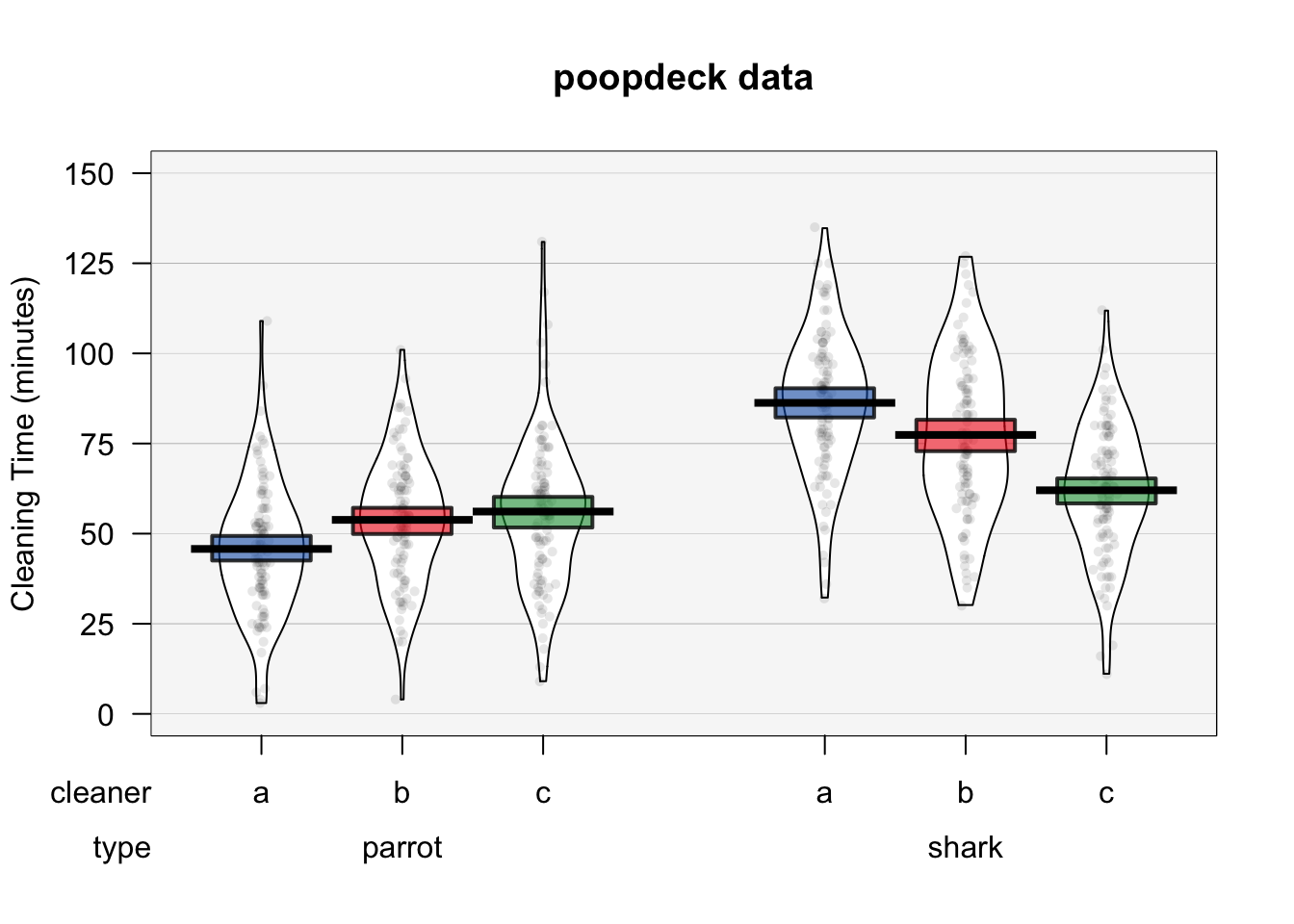 For example, let’s say you want to test how well each of three different cleaning fluids are at getting poop off of your poop deck.To test this, you could do the following: over the course of 300 cleaning days, you clean different areas of the deck with the three different cleaners. You then record how long it takes for each cleaner to clean its portion of the deck. At the same time, you could also measure how well the cleaner is cleaning two different types of poop that typically show up on your deck: shark and parrot. Here, your independent variables cleaner and type are factors, and your dependent variable time is numeric.