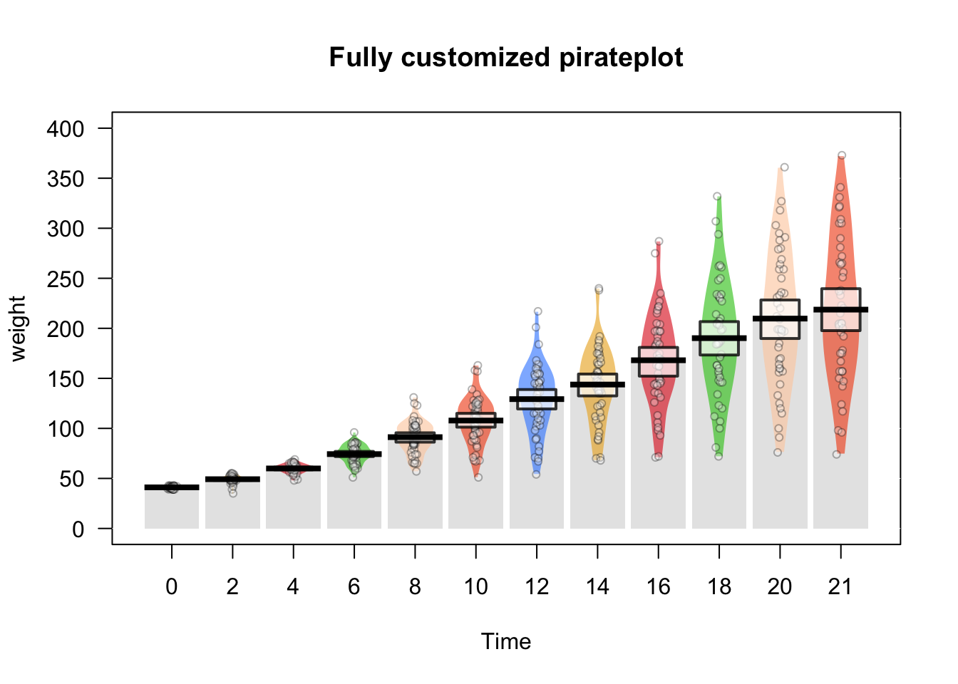 yarrr::pirateplot(formula = weight ~ Time, # dv is weight, iv is Diet