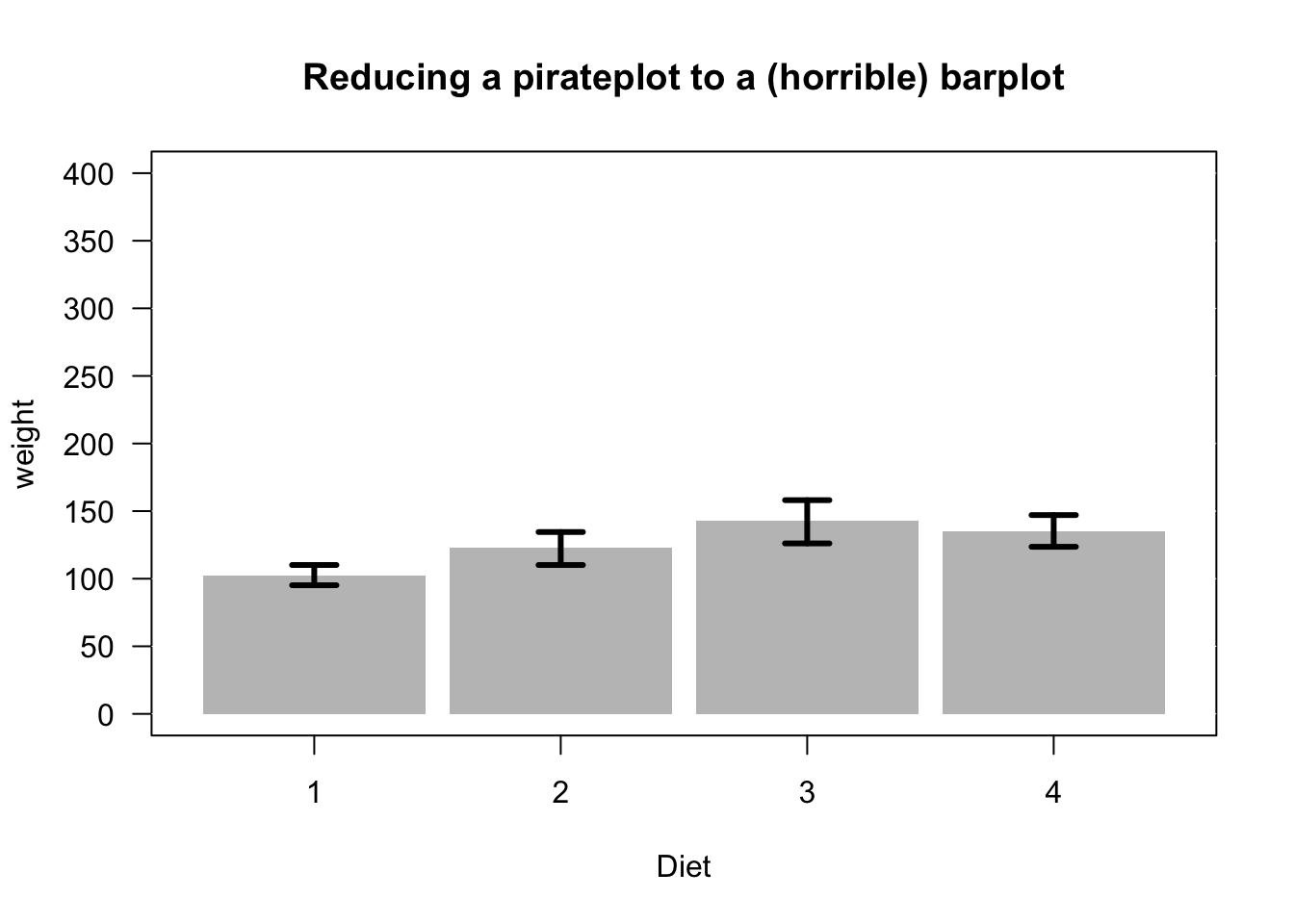 Just to drive the point home, as a barplot is a special case of a pirateplot, you can even reduce a pirateplot into a horrible barplot: