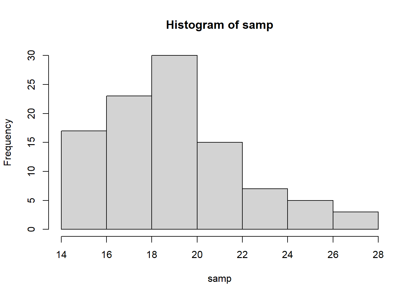 print(samp)## [1] 20 18 15 19 23 19 16 19 21 19 22 22 20 19 20 18 21 24 17 19 17 19 16 20 25 22 25 20 21 20 16 18