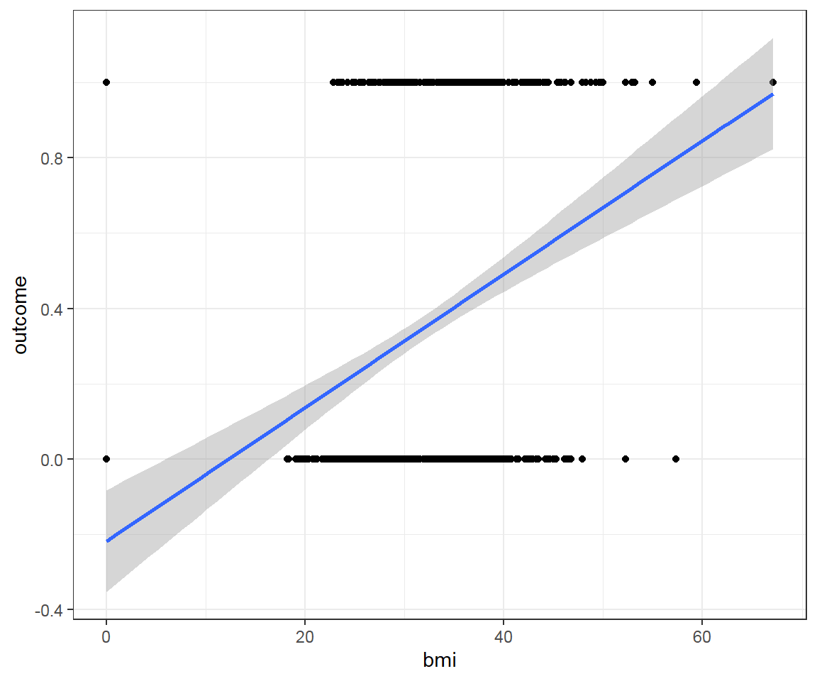 bmi, we even predict probability larger than 1! - The predictions are not sensible as the probability must fall between 0 and 1