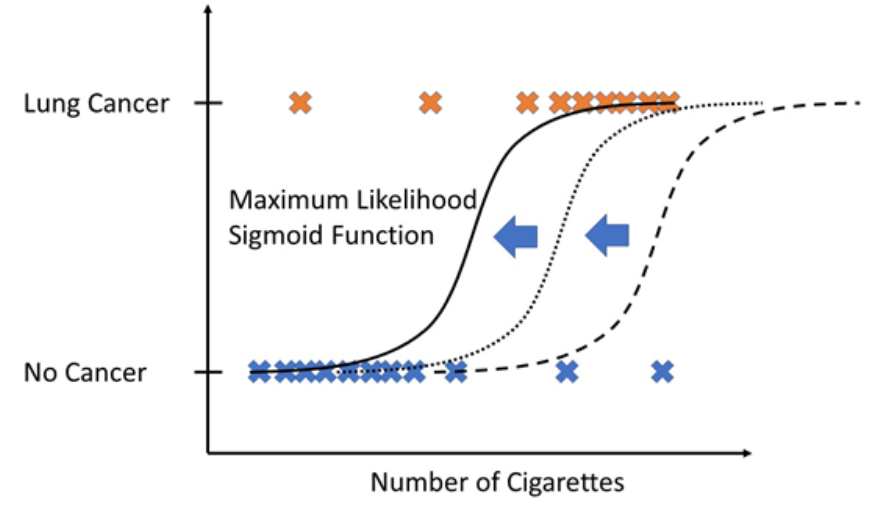 Now, you proceed this same likelihood computation for different sigmoid functions (shifting the sigmoid function a little bit). From all computations, you take the sigmoid function that has “maximum likelihood” that means which would produce the training data with maximal probability.