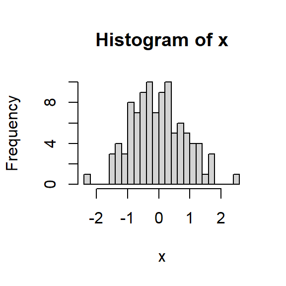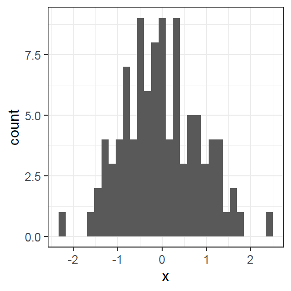 plot_histogram(rnorm_df$x)## `plot_histogram()` uses `bins=30` by default. Pick better value with `bins=`