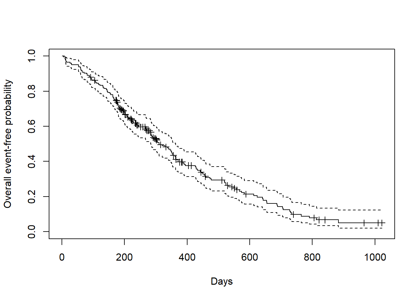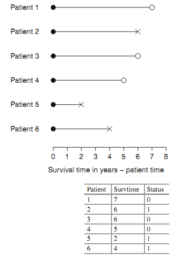 - Survival data is often represented as a pair (\(t_{i}\); \(\delta_{i}\)) where t is the time until endpoint or last follow-up, and \(\delta\) is a 0/1 variable with 0= “subject was censored at t” and 1 = “subject had an event at t”, or in R code as Surv(time, status).