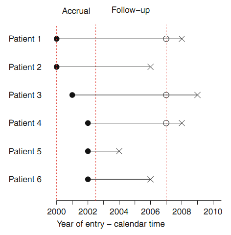 - Type I: censoring times are pre-specified. E.g. cohort of patients