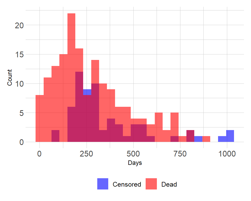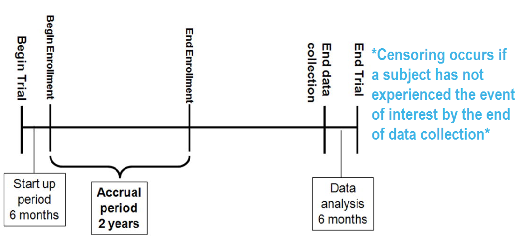 - Right censoring (most common): At the time of an analysis, not everyone will have yet had the event. The final endpoint is only known to exceed a particular value \(\rightarrow\) Incomplete/partial information: if a particular subject was enrolled in a study 2 years ago, and has not yet had an event at the time of analysis, we only know that their time to event is > 2 years.