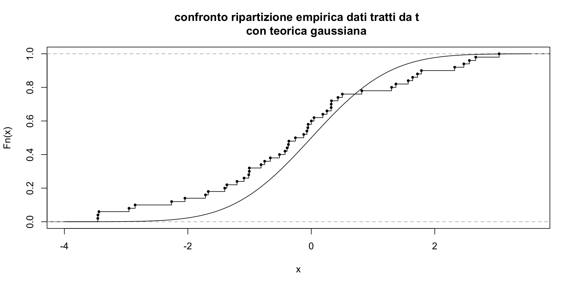 Come si vede, nel secondo caso c’è uno scostamento sensibile fra la funzione di ripartizione empirica per i dati generati da una distribuzione con code pesanti e una ditribuzione gaussiana. In effetti, buona parte delle procedure statistiche per verificare se i dati osservati sono conformi a una distribuzione teorica si basano sul confronto fra tali curve.