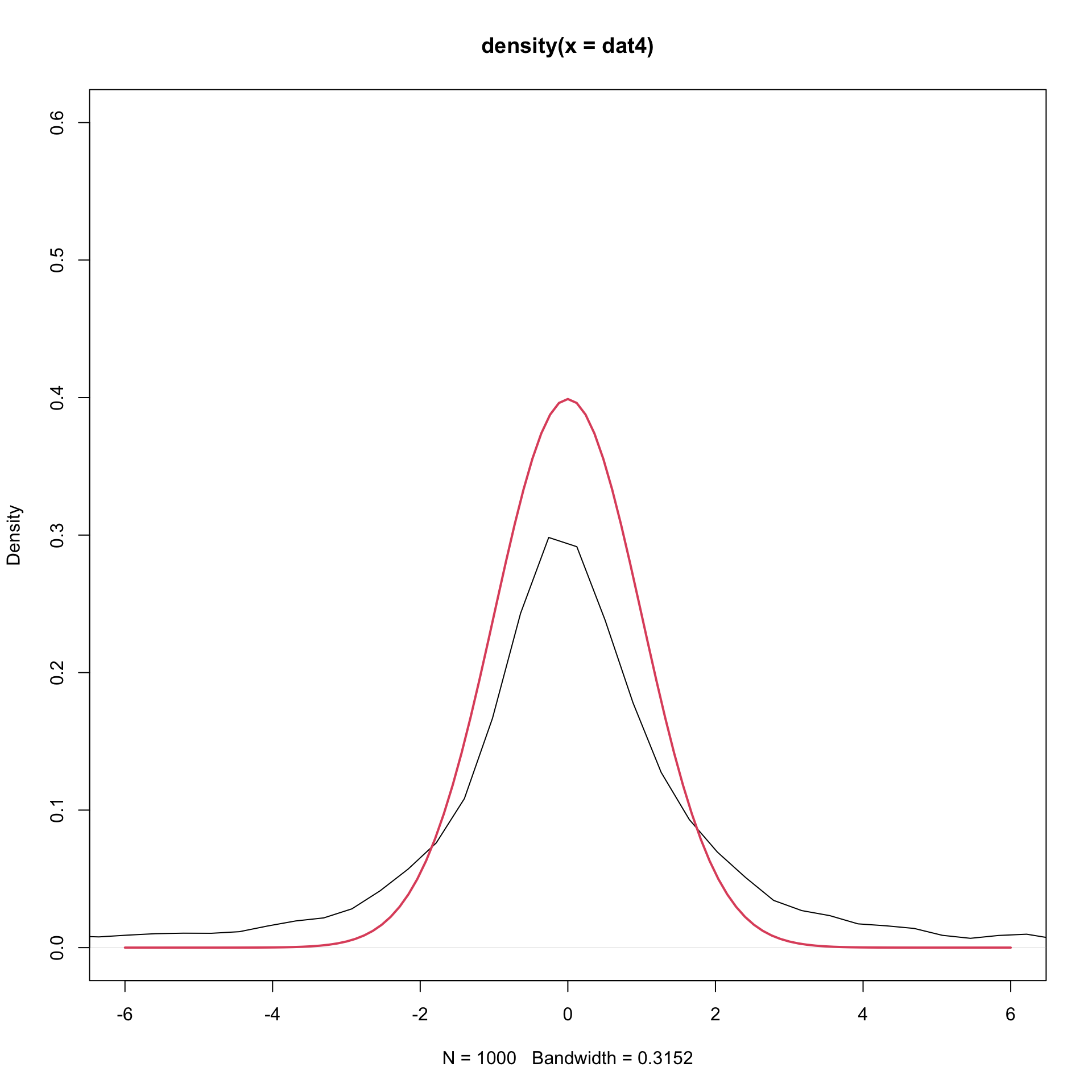 In alternativa, si potrebbe usare la curva di densità empirica ottenuta con il metodo del nucleo. Si può provare a vedere se i dati empirici, generati da una distribuzione con code pesanti, come la t di student con 1 grado di libertà, differiscono dal modello teorico gaussiano.