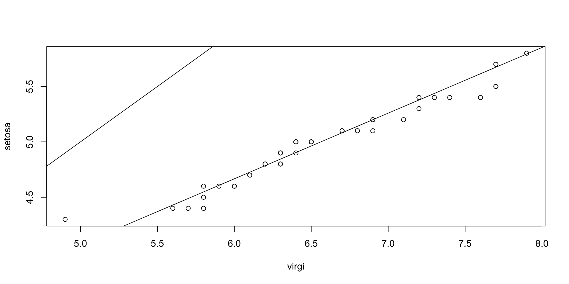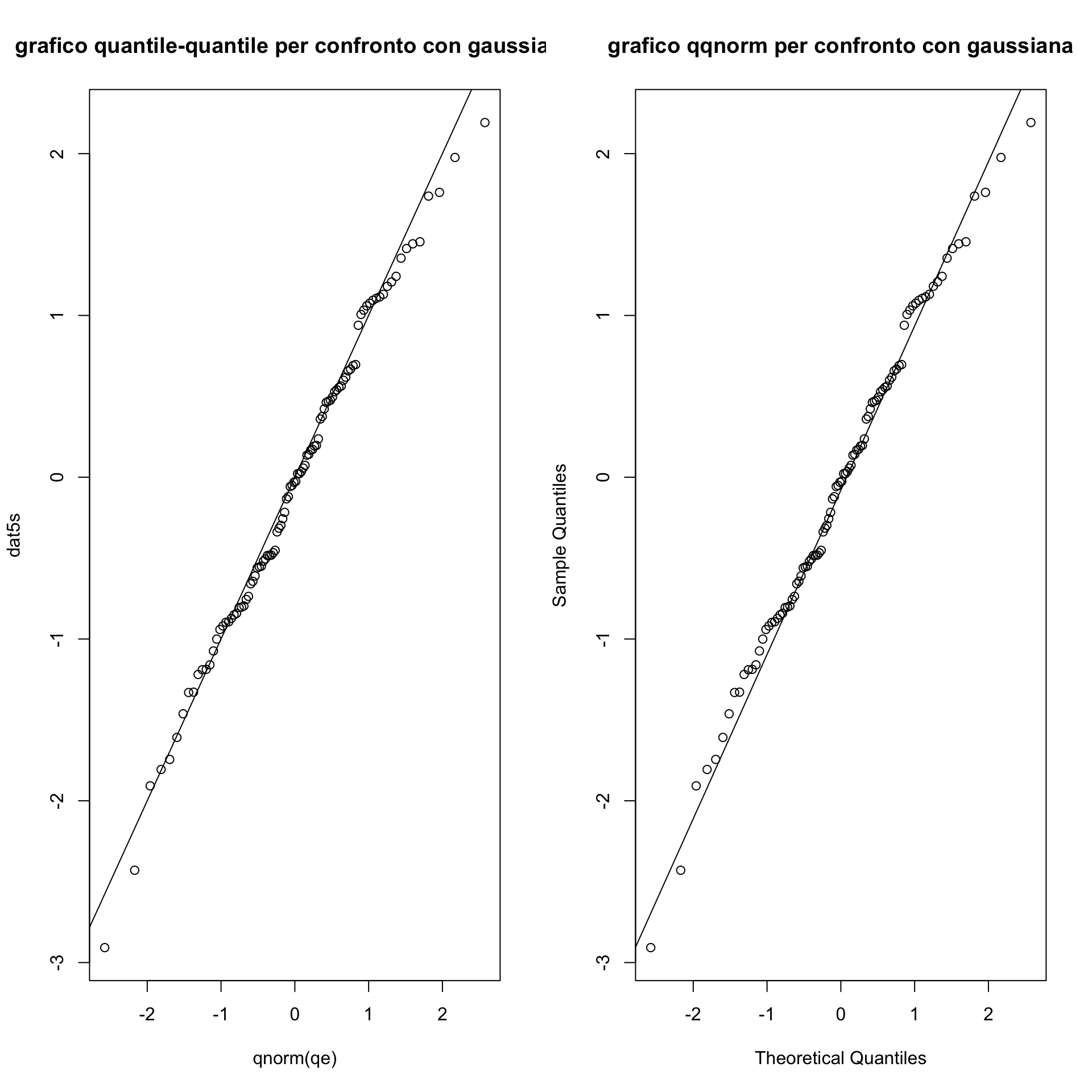 qqline(dat5s) # aggiunge la linea per verificare il confronto