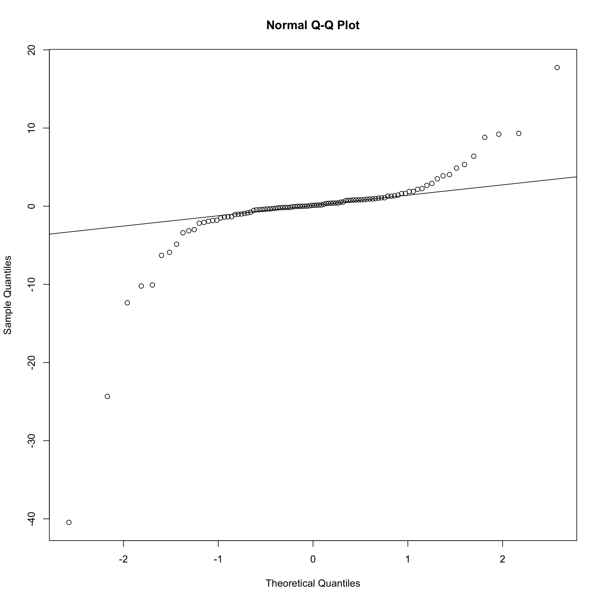 Proviamo ora a vedere cosa accade se confrontiamo i quantili calcolati per i dati tratti da un’altra distribuzione (la solita t di student con 1 gdl) con la gaussiana standard.