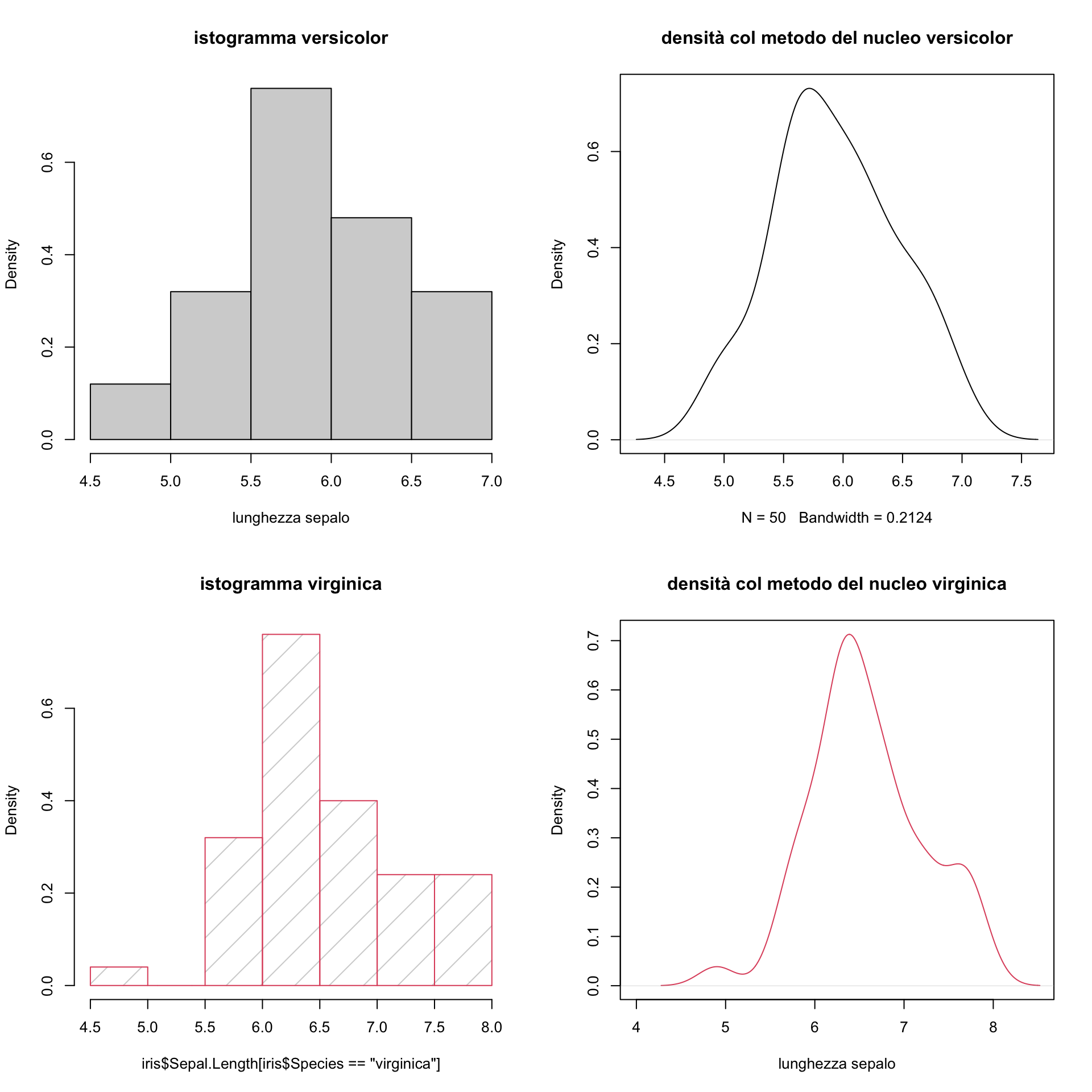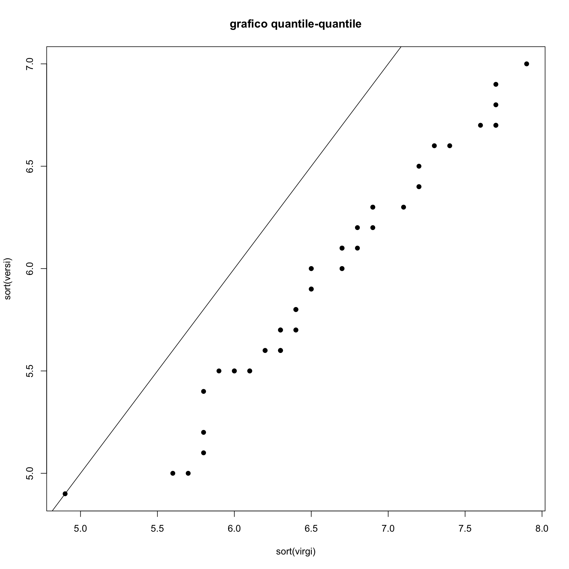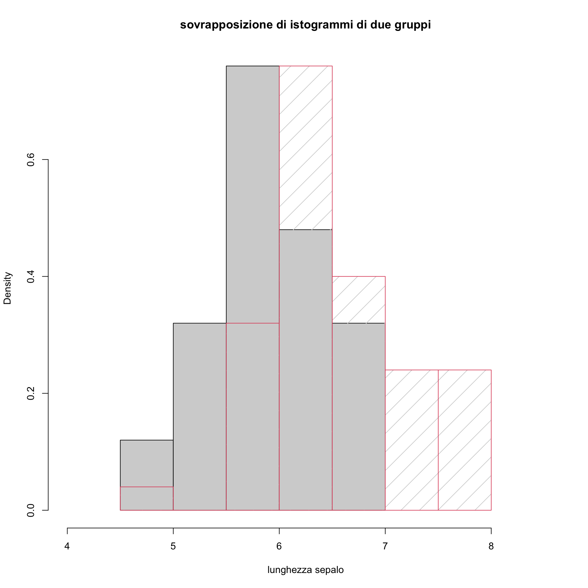 Come si vede la funzione di ripartizione empirica ricavata dai dati per la specie versicolor \(X_v\) è spostata a destra rispetto a quella della specie setosa \(X_s\) (cioè \(\hat{F}_v(x)) \leq \hat{F}_s(x_s))\).