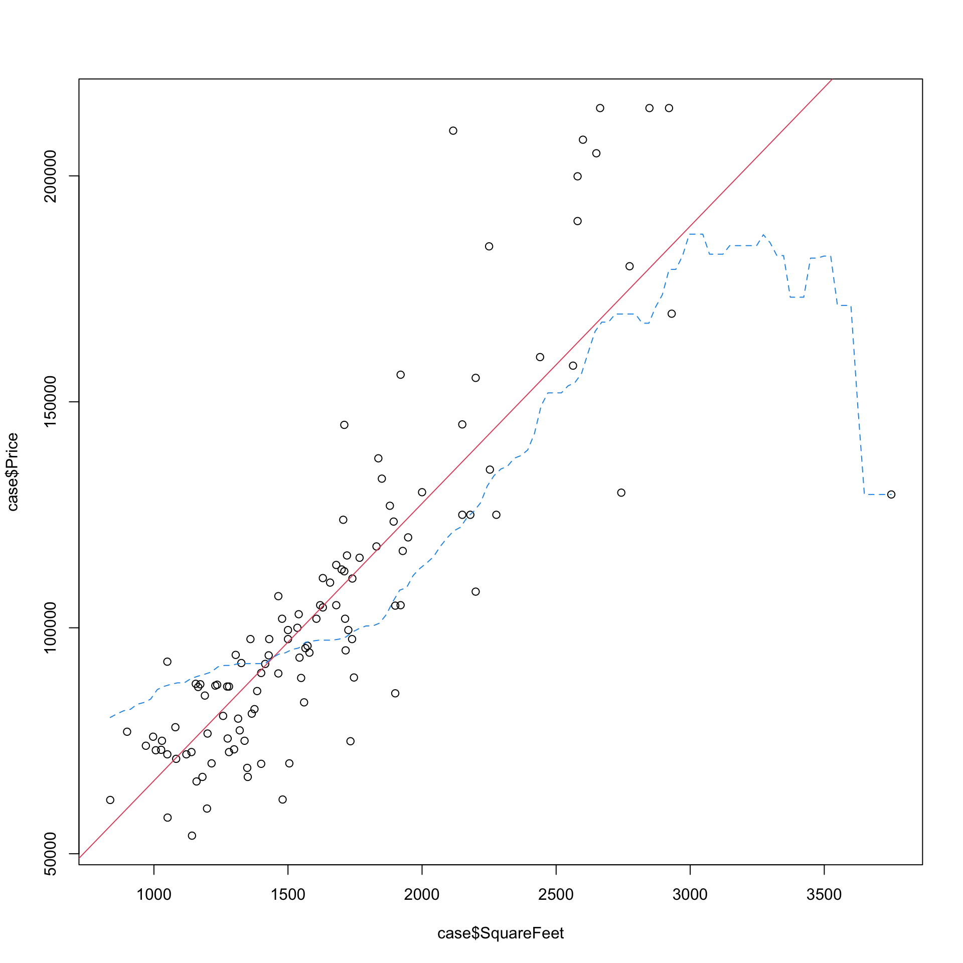 lines(ksmooth(case$SquareFeet,case$Price, bandwidth=1400), col=4, lty=2)