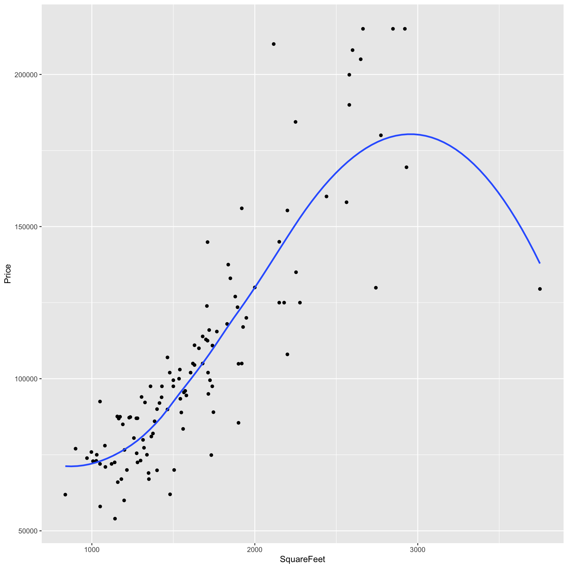 Nel grafico è riportata la retta dei minimi quadrati e una curva (più o meno) liscia che tende a seguire con meno rigidità l’andamento della nuvola; peraltro, ci si potrebbe, ad esempio, ragionevolmente attendere che aumenti della metratura per case molto grandi si tradurranno in aumenti di prezzo inferiori a quelli che si osservano per le case piccole (ci si aspetta che la derivata decresca). In realtà, per i dati americani questo sembra non succedere.