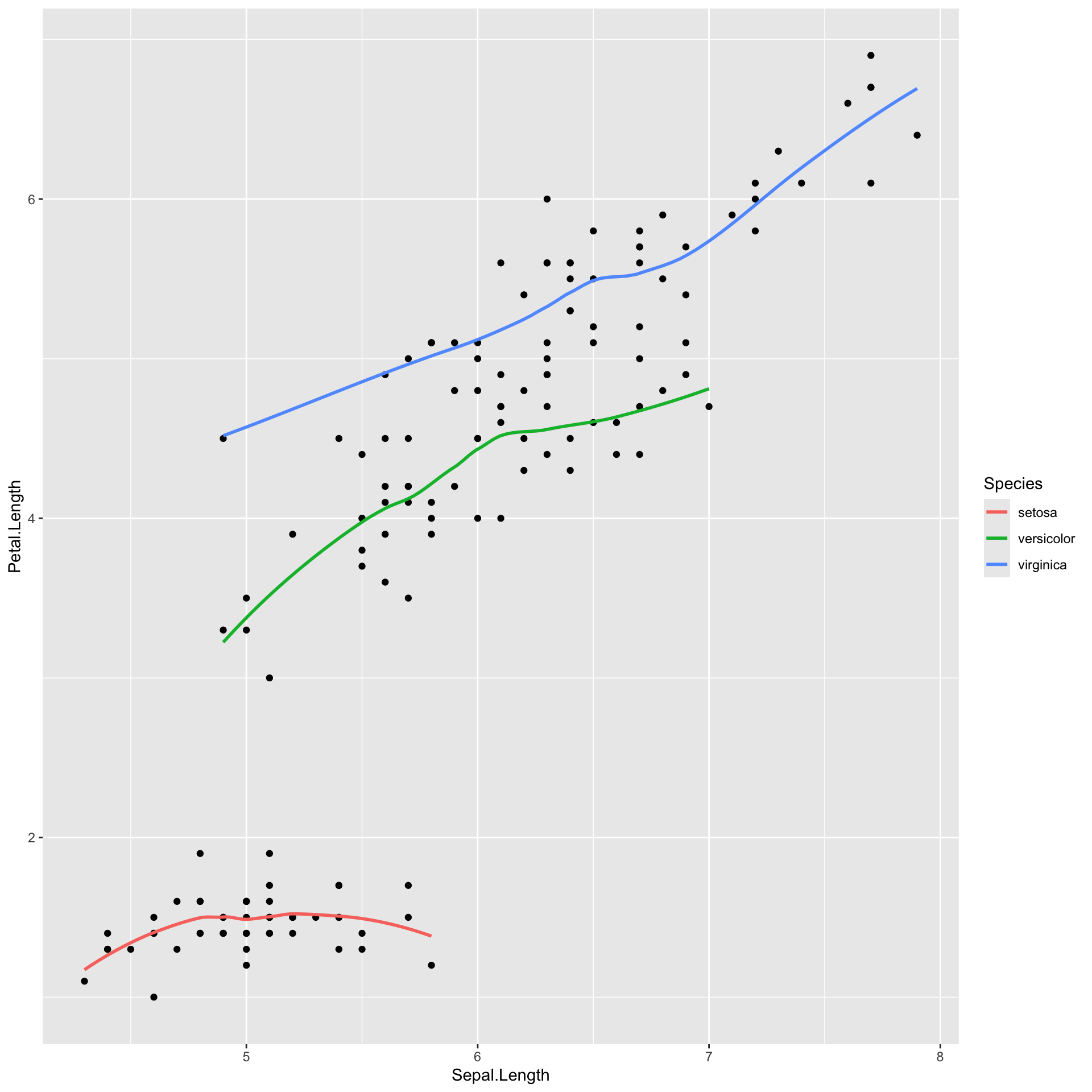 geom_smooth(aes(colour=Species), se=F)## `geom_smooth()` using method = 'loess' and formula = 'y ~ x'
