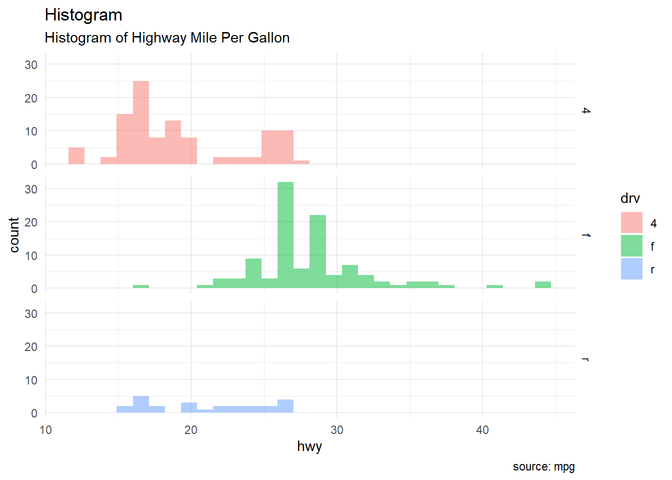 ggplot(data = mpg, aes(x = hwy, fill = drv)) +