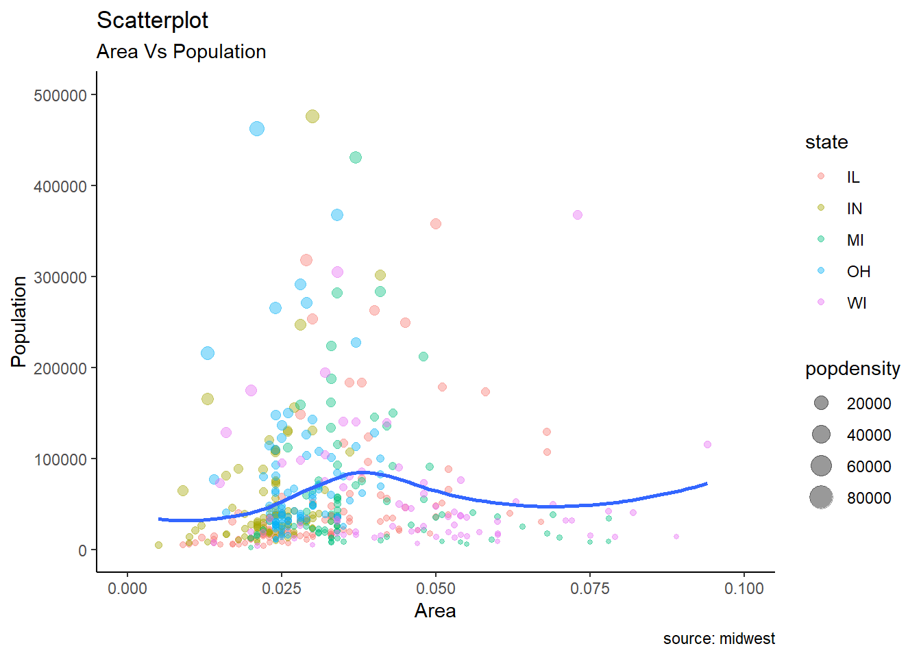 geom_point(aes(color = state, size = popdensity), alpha = 0.4) +