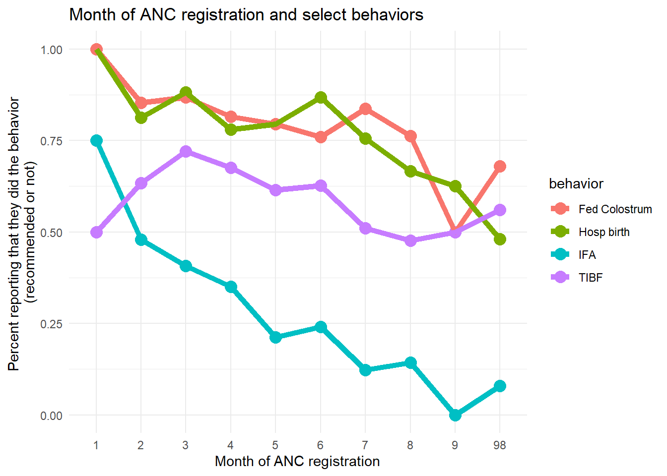 Identifying precisely what predicts greater levels of ASHA interaction will need more investigation, but from this exploratory exercise we have a few general impressions. Intermediate levels of age and age at marriage lead to more ASHA interaction. There is some indication that being in the wealthiest quintile reduces ASHA interaction and that being in the most educated subgroup leads to more ASHA interaction. Muslim women have greater ASHA interaction scores than Hindu women (note, the ethnography suggested that some ASHAs may look down on majority Muslim villages or areas).
