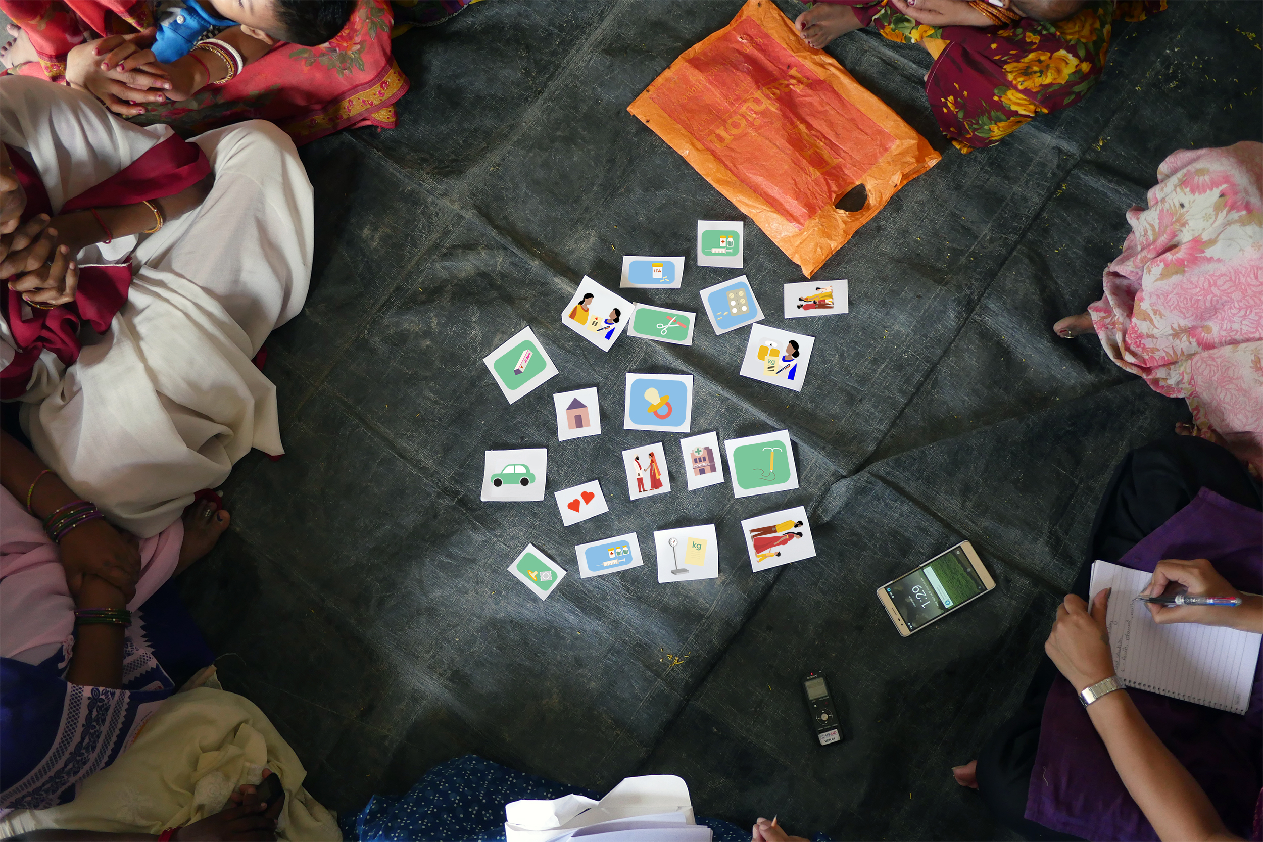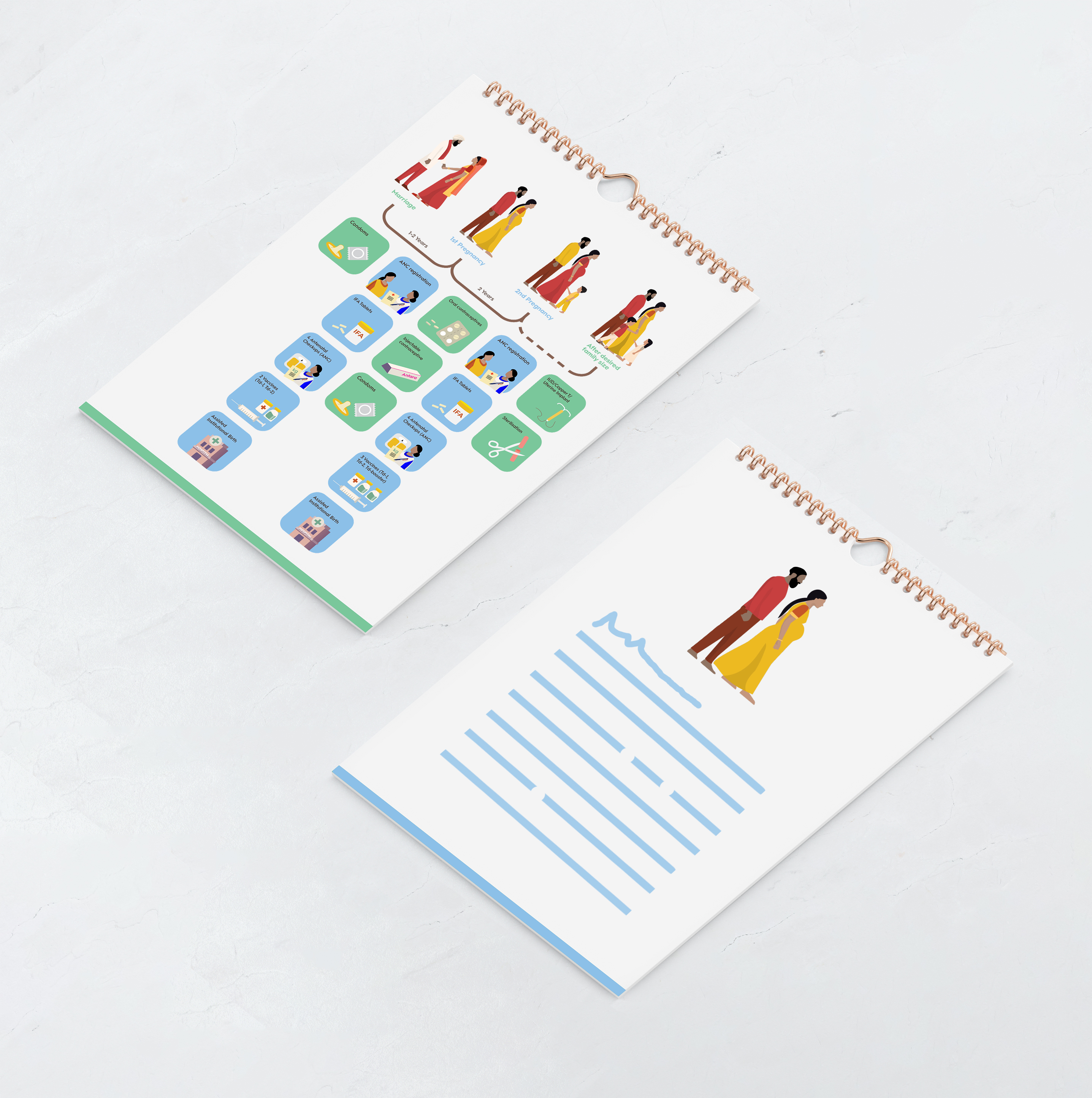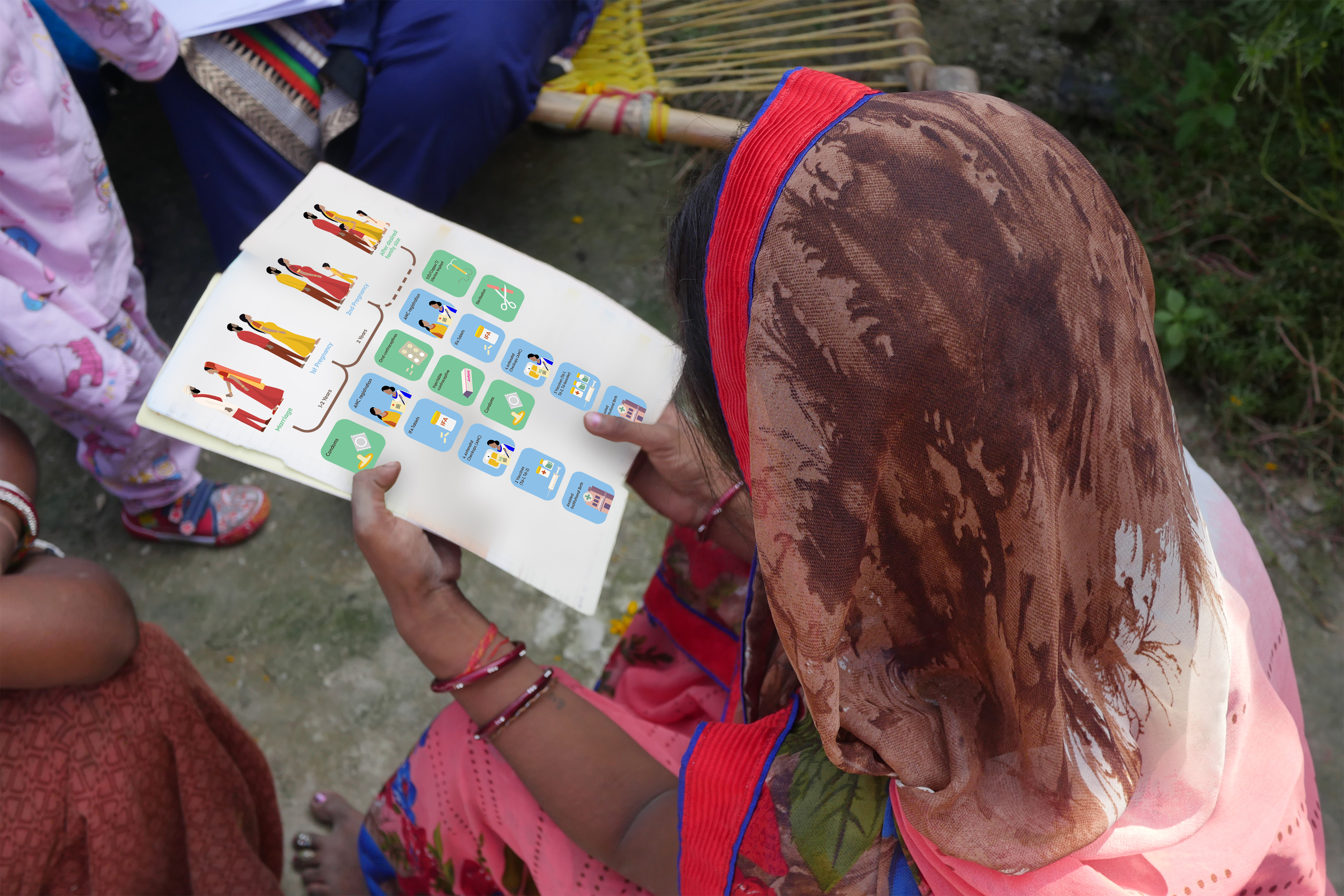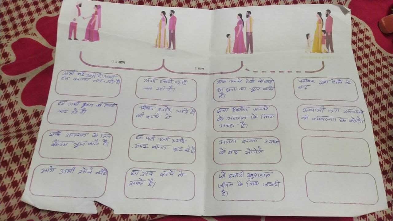 The objective of prototyping was to understand the acceptability of the tool from both ASHAs and newlyweds, to explore options for contents and activities, and then to iterate the concept. The tool was printed for ASHAs to use with newlyweds. Medium fidelity prototypes are given to ASHAs to test with couples in March and April 2021.
