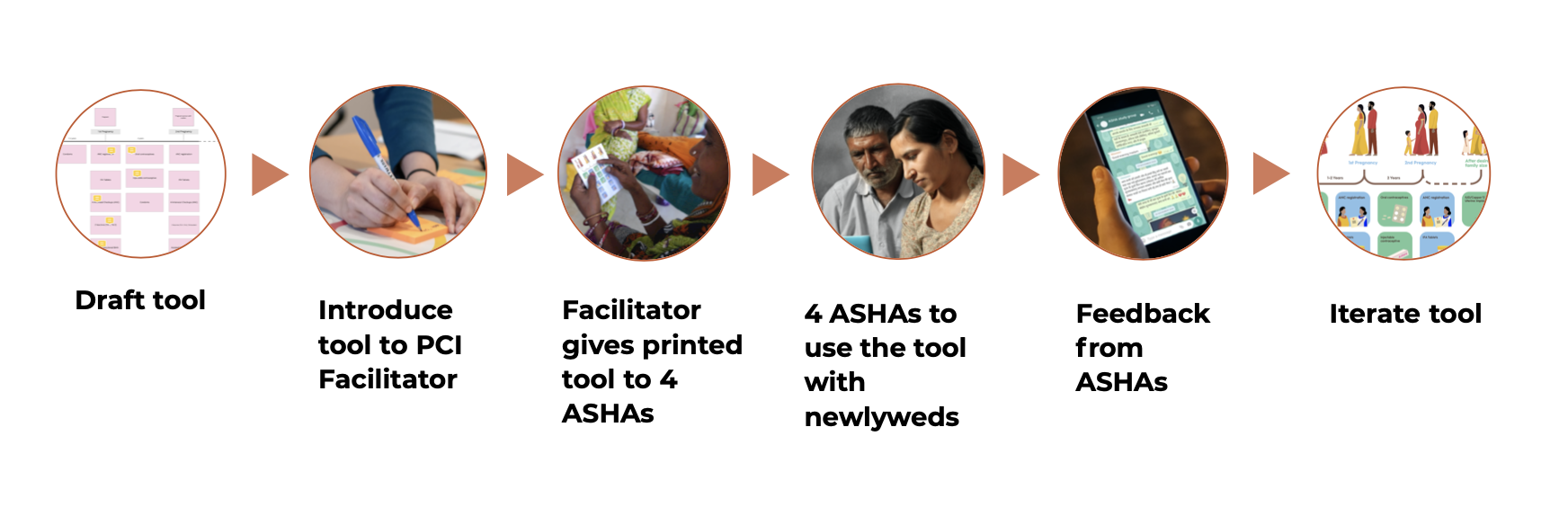 Process from introduction to use - The PCI Facilitator was first trained in the tool, and then they trained 4 ASHAs in the use of this tool, and each ASHA used the tool with 1 newlywed couple or family in their village. After this each ASHA was interviewed to gather feedback and the tool was iterated based on this.