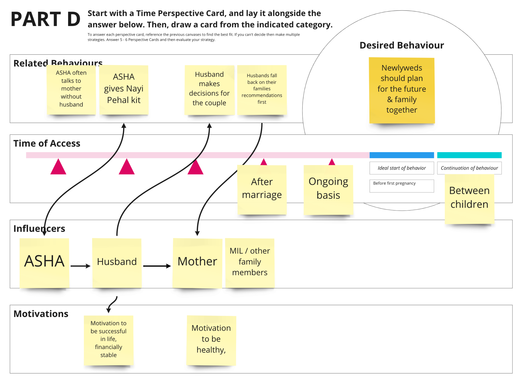 ● The tool leverages ASHAs existing visit after marriage to introduce a tool, or artifact, to the household. The tool will be revisited on an ongoing basis, and revised as needed. ● As the husband has the decision making power in the relationship, the tool targets his motivation for financial stability. ● Furthermore the tool, as an artifact in the household, also has the effect of involving and educating the Mother-In-Law.