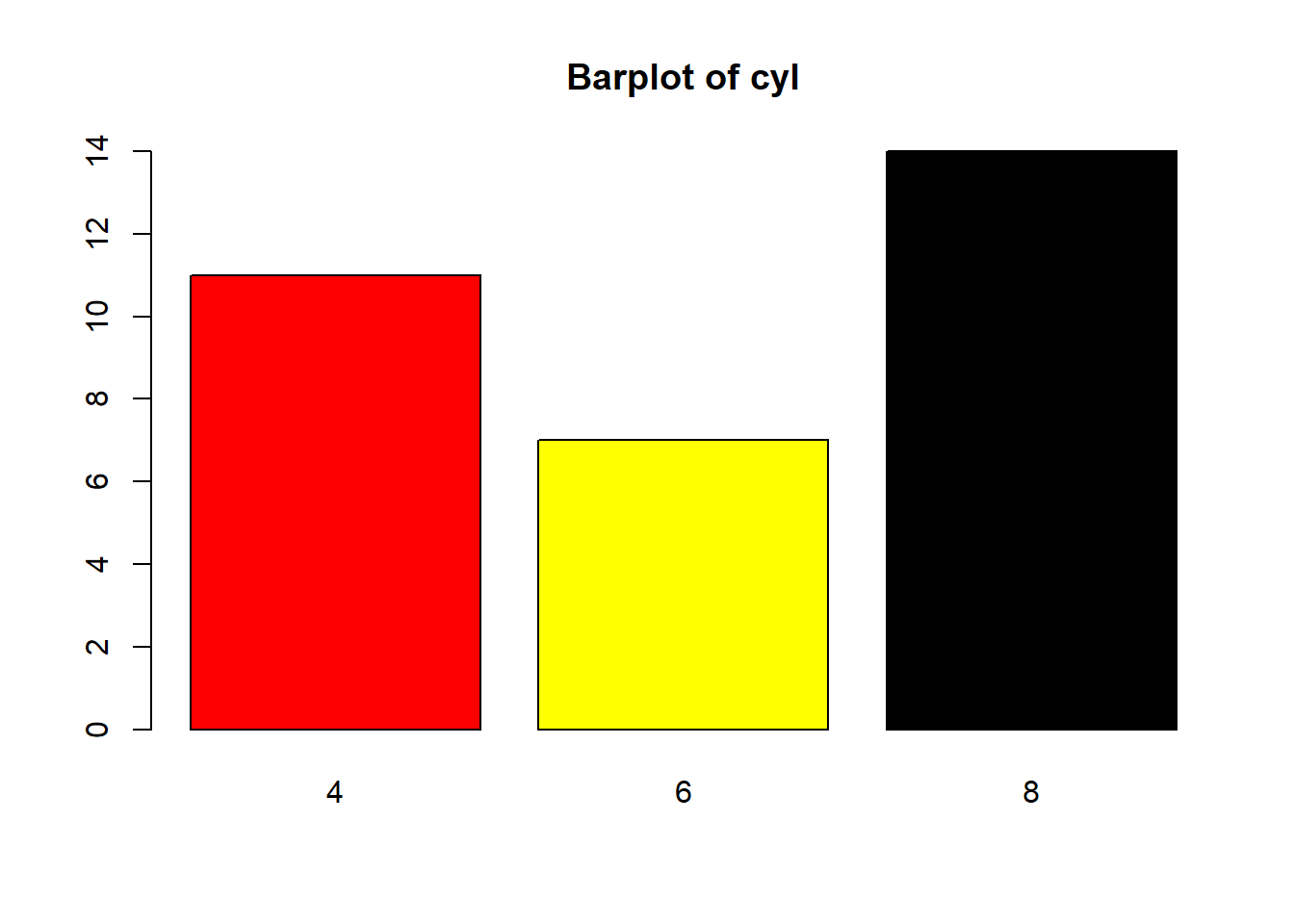 barplot(table(mtcars$cyl),col=c("red","yellow","black"),main="Barplot of cyl")