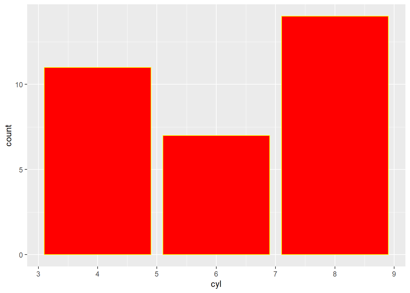 ggplot(mtcars, aes(x=cyl)) + geom_bar(fill="red",col="yellow")
